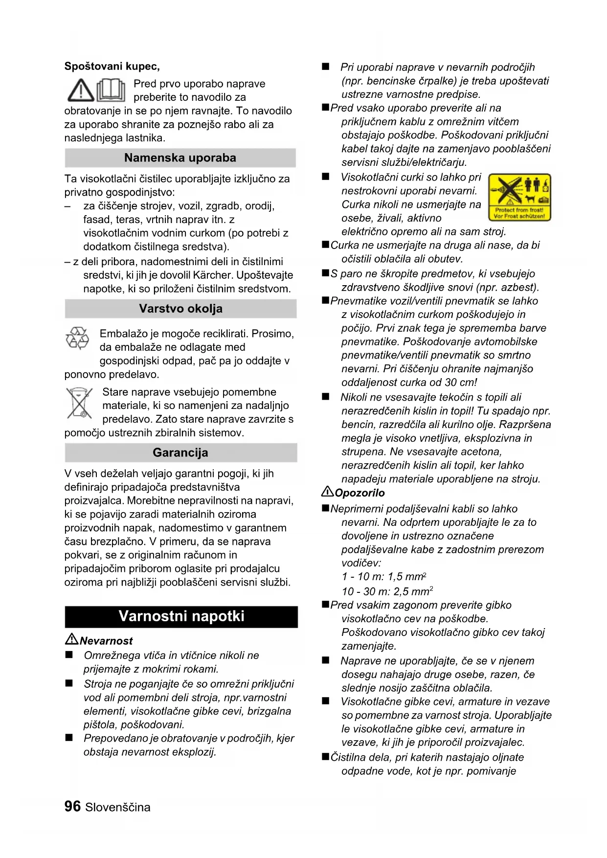 EHS) 2000/14/ES Použité harmonizační normy EN 60335–1 EN 60335–2–79 EN 55014–1: 2000 + A1: 2001 + A2: 2002 EN 55014–2: 1997 + A1: 2001 EN 61000–3–2: 2000 + A2: 2005 EN 61000–3–3: 1995 + A1: 2001 Použitý postup posuzování shody: Příloha V Hladinu akustického dB(A) Namerenou: 85 dB(A) Garantovanou: 87 dB(A)96 Slovenščina Spoštovani kupec, Pred prvo uporabo naprave preberite to navodilo za obratovanje in se po njem ravnajte. To navodilo za uporabo shranite za poznejšo rabo ali za naslednjega lastnika. Ta visokotlačni čistilec uporabljajte izključno za privatno gospodinjstvo: –za čiščenje strojev, vozil, zgradb, orodij, fasad, teras, vrtnih naprav itn. z visokotlačnim vodnim curkom (po potrebi z dodatkom čistilnega sredstva). – z deli pribora, nadomestnimi deli in čistilnimi sredstvi, ki jih je dovolil Kärcher. Upoštevajte napotke, ki so priloženi čistilnim sredstvom. Embalažo je mogoče reciklirati. Prosimo, da embalaže ne odlagate med gospodinjski odpad, pač pa jo oddajte v ponovno predelavo. Stare naprave vsebujejo pomembne materiale, ki so namenjeni za nadaljnjo predelavo. Zato stare naprave zavrzite s pomočjo ustreznih zbiralnih sistemov. V vseh deželah veljajo garantni pogoji, ki jih definirajo pripadajoča predstavništva proizvajalca. Morebitne nepravilnosti na napravi, ki se pojavijo zaradi materialnih oziroma proizvodnih napak, nadomestimo v garantnem času brezplačno. V primeru, da se naprava pokvari, se z originalnim računom in pripadajočim priborom oglasite pri prodajalcu oziroma pri najbližji pooblaščeni servisni službi. Nevarnost ! Omrežnega vtiča in vtičnice nikoli ne prijemajte z mokrimi rokami. ! Stroja ne poganjajte če so omrežni priključni vod ali pomembni deli stroja, npr.varnostni elementi, visokotlačne gibke cevi, brizgalna pištola, poškodovani. ! Prepovedano je obratovanje v področjih, kjer obstaja nevarnost eksplozij. ! Pri uporabi naprave v nevarnih področjih (npr. bencinske črpalke) je treba upoštevati ustrezne varnostne predpise. ! Pred vsako uporabo preverite ali na priključnem kablu z omrežnim vitčem obstajajo poškodbe. Poškodovani priključni kabel takoj dajte na zamenjavo pooblaščeni servisni službi/električarju. ! Visokotlačni curki so lahko pri nestrokovni uporabi nevarni. Curka nikoli ne usmerjajte na osebe, živali, aktivno električno opremo ali na sam stroj. ! Curka ne usmerjajte na druga ali nase, da bi očistili oblačila ali obutev. ! S paro ne škropite predmetov, ki vsebujejo zdravstveno škodljive snovi (npr. azbest). ! Pnevmatike vozil/ventili pnevmatik se lahko z visokotlačnim curkom poškodujejo in počijo. Prvi znak tega je sprememba barve pnevmatike. Poškodovanje avtomobilske pnevmatike/ventili pnevmatik so smrtno nevarni. Pri čiščenju ohranite najmanjšo oddaljenost curka od 30 cm! ! Nikoli ne vsesavajte tekočin s topili ali nerazredčenih kislin in topil! Tu spadajo npr. bencin, razredčila ali kurilno olje. Razpršena megla je visoko vnetljiva, eksplozivna in strupena. Ne vsesavajte acetona, nerazredčenih kislin ali topil, ker lahko napadeju materiale uporabljene na stroju. 몇 Opozorilo ! Neprimerni podaljševalni kabli so lahko nevarni. Na odprtem uporabljajte le za to dovoljene in ustrezno označene podaljševalne kabe z zadostnim prerezom vodičev: