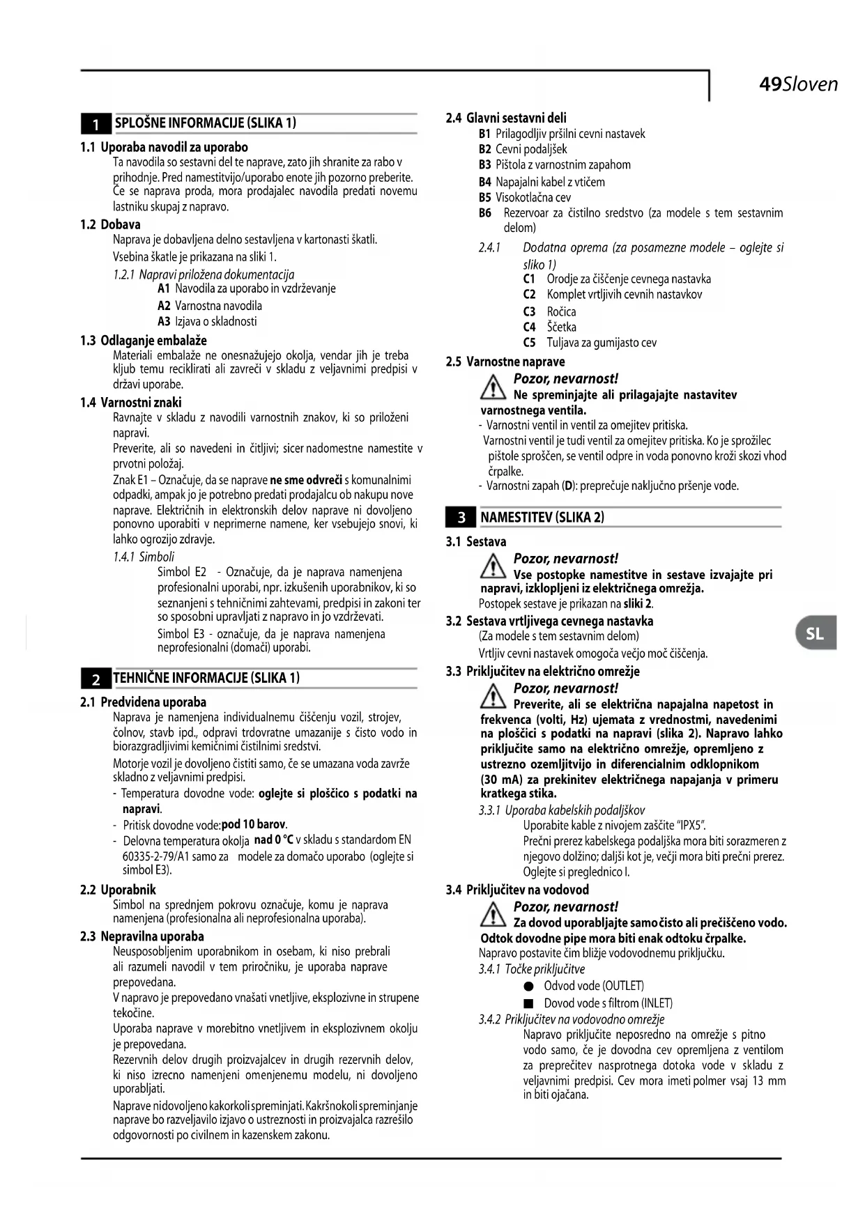 B1 Prilagodljiv pršilni cevni nastavekB2 Cevni podaljšekB3 Pištola z varnostnim zapahomB4 Napajalni kabel z vtičemB5 Visokotlačna cev B6 Rezervoar za čistilno sredstvo (za modele s tem sestavnim delom)