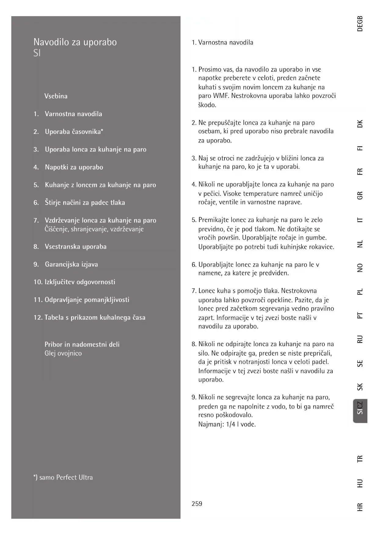 HR264 Časovnik (12) na ročaju pokrova (5) vklopite in vnesite* želeni kuhalni čas. Lonec za kuhanje na paro segrevajte pri najvišji kuhalni stopnji. Preko avtomatskega segrevanja (4), ki je obenem varnostni ventil, izhaja v fazi zavretja zrak tako dolgo, dokler se ventil slišno ne zapre in se tlak ne začne dvigovati. Rdeč prikaz (24) na časovniku (12) signalizira, da lonca sedaj več ni dovoljeno odpreti*. Kuhalni signal (1) prične naraščati. Naraščanje lahko opazujete preko odprtine zraven kuhalnega signala (I) in pravočasno uravnavate dovajanje energije. Časovnik (12) zvočno signalizira (3-krat kratko), da je dosežena nastavljena kuhalna stopnja. Od sedaj na- prej se nastavljeni kuhalni čas začne odštevati (V)*. 5.4. Kuhalni časi Časovnik (12) signalizira začetek kuhalnega časa*. Pazite, da pozicija obroča na kuhalnem signalu (1) ostane stabilna. Ustrezno regulirajte dovod energije. Če kuhalni signal (1) pade pod potrebni oranžni kuhalni obroč, morate kuhalno stopnjo povečati. Zaradi tega se kuhalni čas podaljša. Če se kuhalni signal (1) poveča čez nastavljeno kuhalno stopnjo (30c)/(30d), nastaja previsok parni tlak, ki slišno uhaja preko glavnega ventila (3) spredaj na ročaju pokrova (5). Lonec takoj odsta- vite s štedilnika; počakajte, da se kuhalni signal (1) spusti na ustrezni kuhalni obroč in nato pri zmanj- šanem dovajanju energije postavite na štedilnik. Kratki časi kuhanja so pri kuhanju z loncem možni zaradi tega, ker zaradi parnega tlaka v loncu nastanejo višje temperature: Prvi obroč, okoli 110 °C (45 kPa delovnega tlaka, 90 kPa rednega tlaka) za občutljive jedi, kakor so ribe ali kompoti. Drugi obroč, okoli 119 °C (95 kPa delovnega tlaka, 130 kPa rednega tlaka, največ 150 kPa) za vse preostale jedi. Če želite prihraniti energijo, izklopite kuhalno ploščo že pred koncem časa kuhanja, ker v loncu shranjena toplota zadostuje za končanje postopka kuhanja. Kuhalni časi so pri isti jedi lahko različni, ker so lahko količina, oblika in kakovost živil različne. 5.5. Nasvet pri indukcijskih štedilnikih Dno za vse vrste štedilnikov TransTherm® (11) je primerno za vse vrste štedilnikov, tudi za indukcij- ske. Pri indukcijskih štedilnikih lahko pri visoki ku- halni stopnji nastane brenčanju podoben zvok. Ta zvok je tehnično pogojen in ni znak za okvaro štedilnika ali lonca za kuhanje na paro. Velikost lonca in kuhalne površine se mora ujemati, ker v nasprotnem primeru, zlasti pri majhnih premerih, obstaja možnost, da kuhalna površina (magnetno polje) ne reagira na dno lonca. 5.6. Odpiranje lonca Časovnik (12) signalizira konec kuhalnega časa z zvočnim signalom (5-krat kratko), ki se – če ga ne izklopite – ponovi do 4-krat. Zvok lahko izklopite s pritiskom na tipko za plus ali minus (25)/(26)*. Imate štiri možnosti, da zmanjšate tlak v loncu – glejte naslednjo stran. Pokrov lahko odprete in snamete z lonca, ko je lonec brez tlaka. Prepoznate ga po tem, da se zamenja prikaz (24) na časovniku (12) iz rdeče v zeleno (utripajoče) (W)*. Poleg tega mora kuhalni signal (1) popolnoma izginiti (J) v ročaju (5). Če na časovniku (12)* utripa rdeč prikaz (24), čeprav je kuhalni signal (1) izginil v loncu, deluje t.i. varovalo preostalega tlaka. Razrahljajte ga tako, da vrtljivi gumb (8) še enkrat potisnete naprej in nazaj (A). Preden lonec odprete, ga na rahlo potresite. Na ta način se izločijo eventualno prisotni parni mehurčki, ki nastanejo zlasti pri tekočih in kašnatih jedeh, in po snemanju pokrova lahko brizgajo iz iz jedi. Sedaj zasukajte ročaj pokrova (5), kot je bilo prej opisano, v desno in pokrov dvignite. *samo Perfect Ultra265