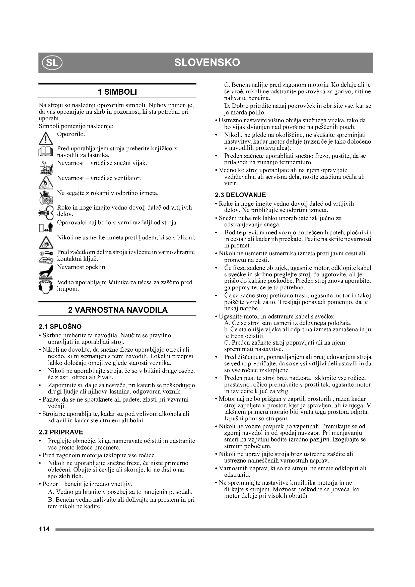 1 SIMBOLI Na stroju so naslednji opozorilni simboli. Njihov namen je, da vas opozarjajo na skrb in pozornost, ki sta potrebni pri uporabi. Simboli pomenijo naslednje: Opozorilo. Pred uporabljanjem stroja preberite knjižico z navodili za lastnika. Nevarnost – vrteči se snežni vijak. Nevarnost – vrteči se ventilator. Ne segajte z rokami v odprtino izmeta. Roke in noge imejte vedno dovolj daleč od vrtljivih delov. Opazovalci naj bodo v varni razdalji od stroja. Nikoli ne usmerite izmeta proti ljudem, ki so v bližini. Pred začetkom del na stroju izvlecite in varno shranite kontaktni ključ. Nevarnost opeklin. Vedno uporabljajte ščitnike za ušesa za zaščito pred hrupom. 2 VARNOSTNA NAVODILA