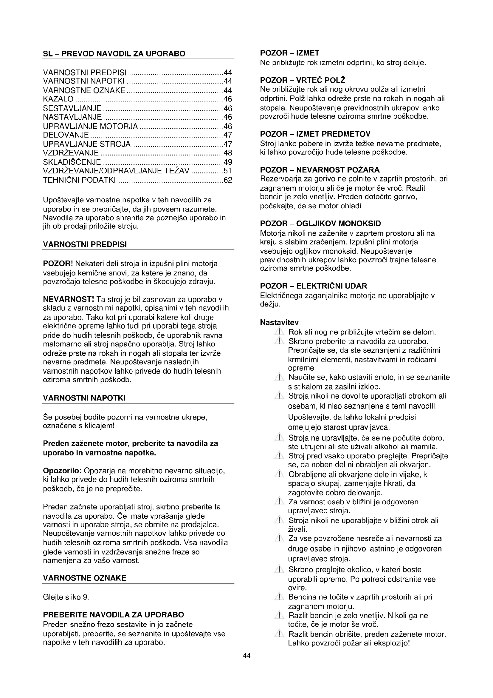 Preden začnete uporabljati stroj, skrbno preberite ta navodila za uporabo. Če imate vprašanja glede varnosti in uporabe stroja, se obrnite na prodajalca. Neupoštevanje varnostnih napotkov lahko privede do hudih telesnih oziroma smrtnih poškodb. Vsa navodila glede varnosti in vzdrževanja snežne freze so namenjena za vašo varnost.