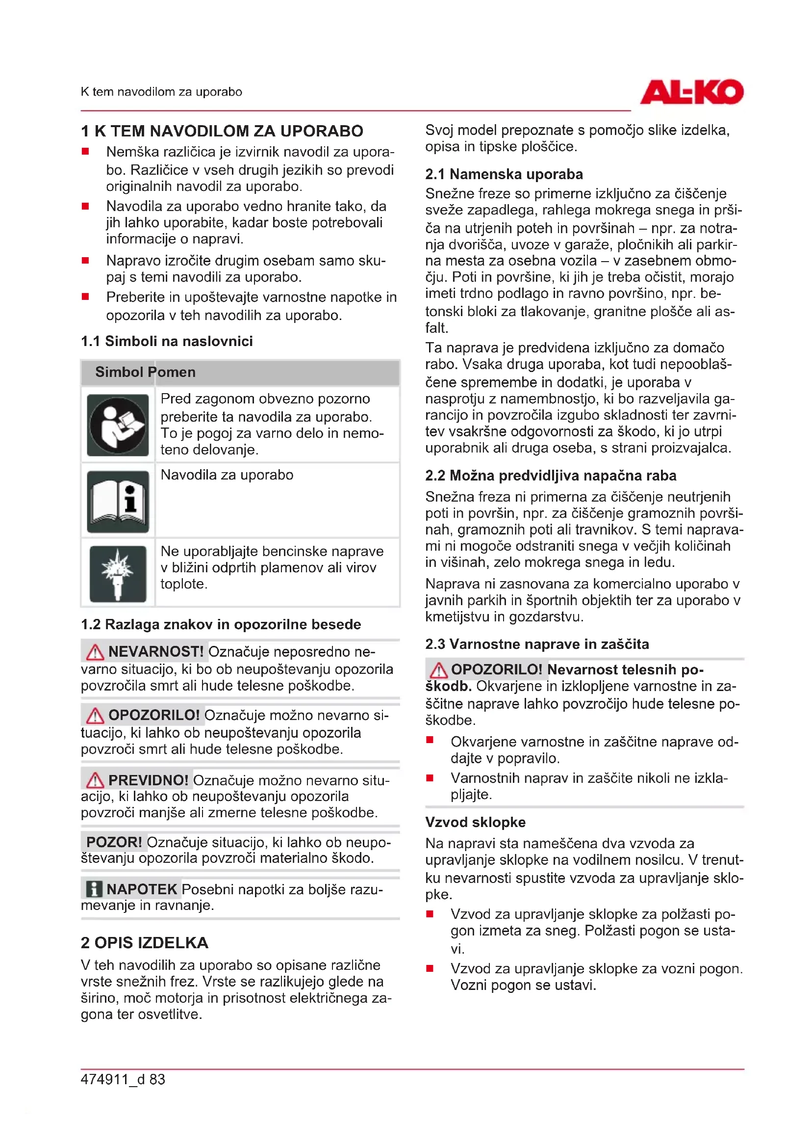 NEVARNOST! Označuje neposredno ne- varno situacijo, ki bo ob neupoštevanju opozorila povzročila smrt ali hude telesne poškodbe. OPOZORILO! Označuje možno nevarno si- tuacijo, ki lahko ob neupoštevanju opozorila povzroči smrt ali hude telesne poškodbe. PREVIDNO! Označuje možno nevarno situ- acijo, ki lahko ob neupoštevanju opozorila povzroči manjše ali zmerne telesne poškodbe. POZOR! Označuje situacijo, ki lahko ob neupo- števanju opozorila povzroči materialno škodo. NAPOTEK Posebni napotki za boljše razu- mevanje in ravnanje. 2 OPIS IZDELKA V teh navodilih za uporabo so opisane različne vrste snežnih frez. Vrste se razlikujejo glede na širino, moč motorja in prisotnost električnega za- gona ter osvetlitve. Svoj model prepoznate s pomočjo slike izdelka, opisa in tipske ploščice.