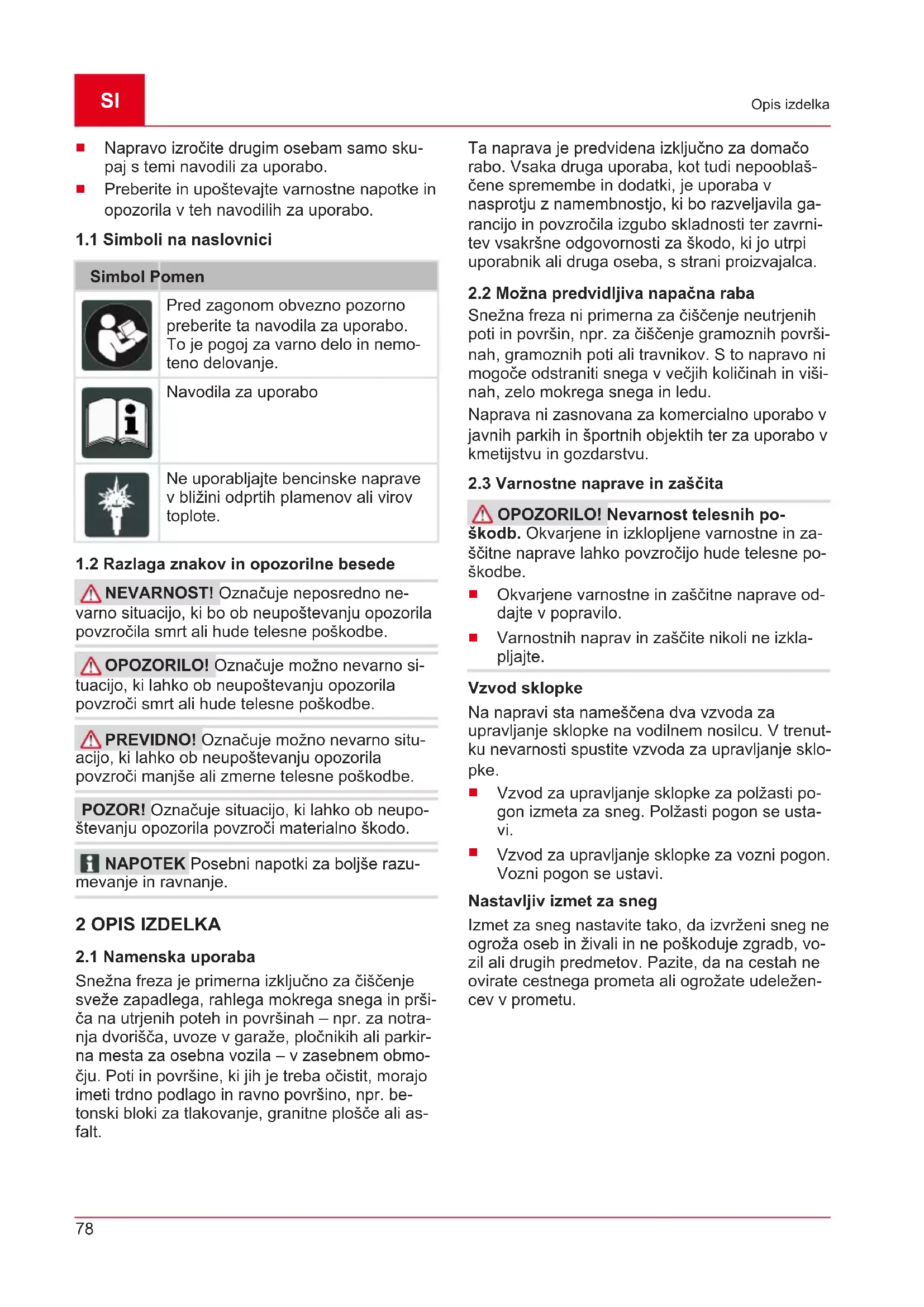 Pregled izdelka (01) da pregled nad napravo. Št. Sestavni del 1 Ogrevalne ročice 2 Stikalo za osvetlitev 3 Stikalo za ogrevanje ročice 4 Nadomestni strižni sornik 5 Vzvod za upravljanje sklopke za polžasti pogon 6 Ročaj za krmiljenje višine izmeta 7 Prestavna ročica, 6 prestav za vožnjo naprej in 2 prestavi za vzvratno vožnjo 8 Vzvod za upravljanje sklopke za vozni pogon 9 Deflektor na izmetu za sneg za nastavi- tev višine izmeta469370_d 81 Varnostni napotki Št. Sestavni del 10 Izmet za sneg z zaščito pred posega- njem 11 Osvetlitev 12 Ročica za nastavitev smeri izmeta 13 Pokrov rezervoarja 14 Pokrov za polnjenje olja 15 Plošča 16 Čistilno orodje (pritrjeno na plošči) 17 Vtič vžigalne svečke 18 Transportni polž 19 Izmetno kolesce 20 Čistilna plošča 21 Po višini nastavljiva drsna tirnica 3 VARNOSTNI NAPOTKI NEVARNOST! Smrtna nevarnost in ne- varnost hudih telesnih poškodb! Nepoznava- nje varnostnih napotkov in navodil za upravljanje lahko povzroči zelo hude telesne poškodbe in po- sledično smrt.