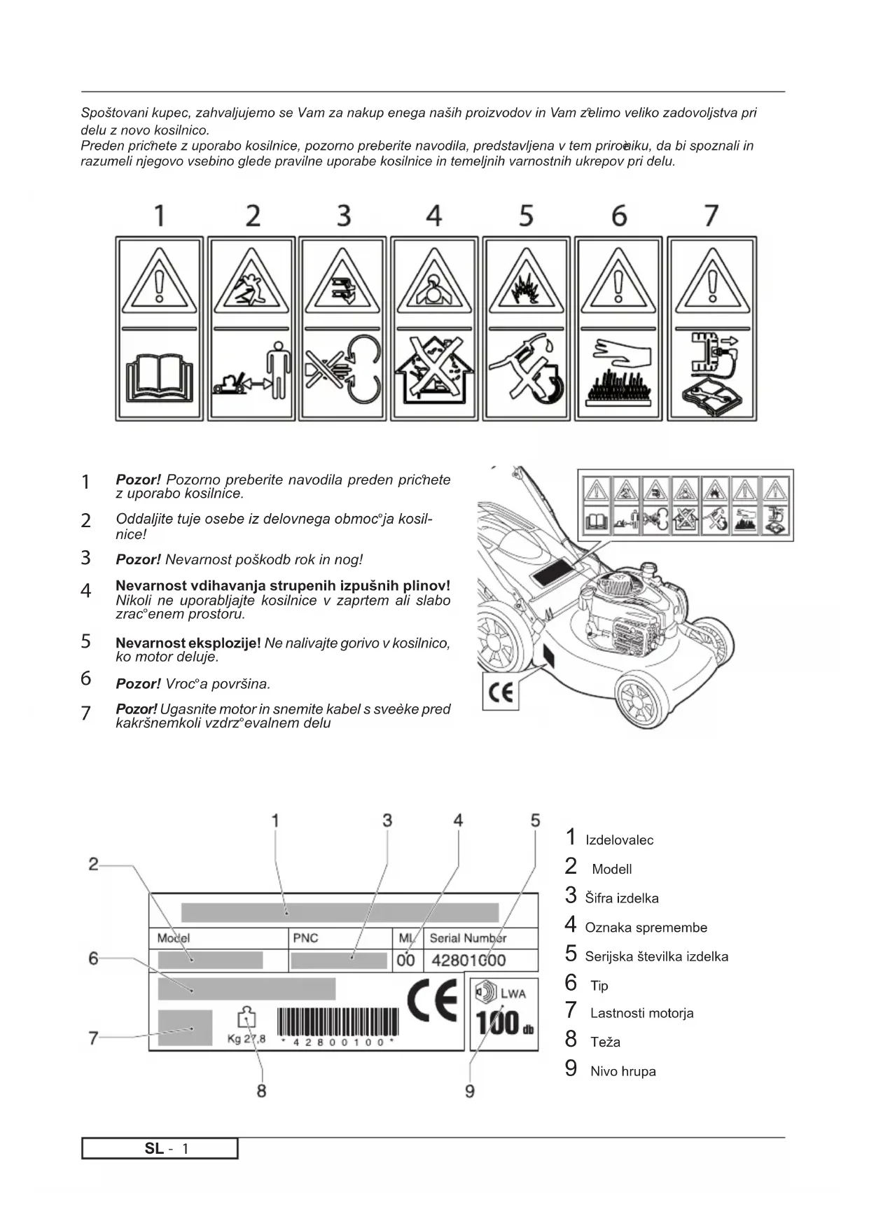 Pozor! Pozorno preberite navodila preden pric°nete z uporabo kosilnice. Oddaljite tuje osebe iz delovnega obmoc°ja kosil- nice! Pozor! Nevarnost poškodb rok in nog! Nevarnost vdihavanja strupenih izpušnih plinov! Nikoli ne uporabljajte kosilnice v zaprtem ali slabo zrac°enem prostoru. Nevarnost eksplozije! Ne nalivajte gorivo v kosilnico, ko motor deluje. Pozor! Vroc°a površina. Pozor! Ugasnite motor in snemite kabel s sveèke pred kakršnemkoli vzdrz°evalnem delu Spoštovani kupec, zahvaljujemo se Vam za nakup enega naših proizvodov in Vam z°elimo veliko zadovoljstva pri delu z novo kosilnico. Preden pric°nete z uporabo kosilnice, pozorno preberite navodila, predstavljena v tem priroèniku, da bi spoznali in razumeli njegovo vsebino glede pravilne uporabe kosilnice in temeljnih varnostnih ukrepov pri delu. 1 Izdelovalec 2 Modell 3 Šifra izdelka 4 Oznaka spremembe 5 Serijska številka izdelka 6 Tip 7 Lastnosti motorja 8 Teža 9 Nivo hrupaSL -