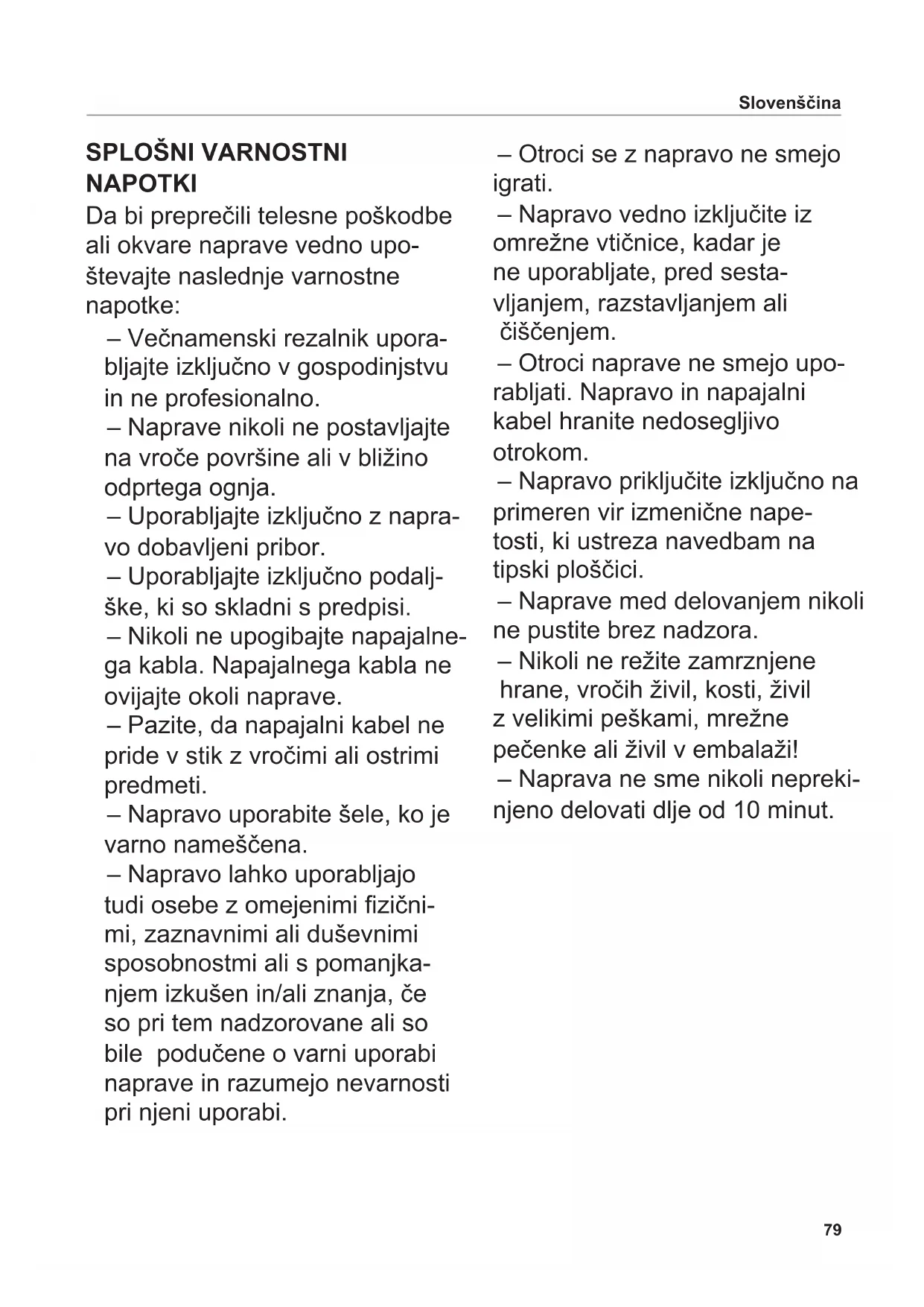 - Zavarujte roke tako, da vedno uporabljate sani za živilo in držalo. Izjema: izredno velik kos živila.