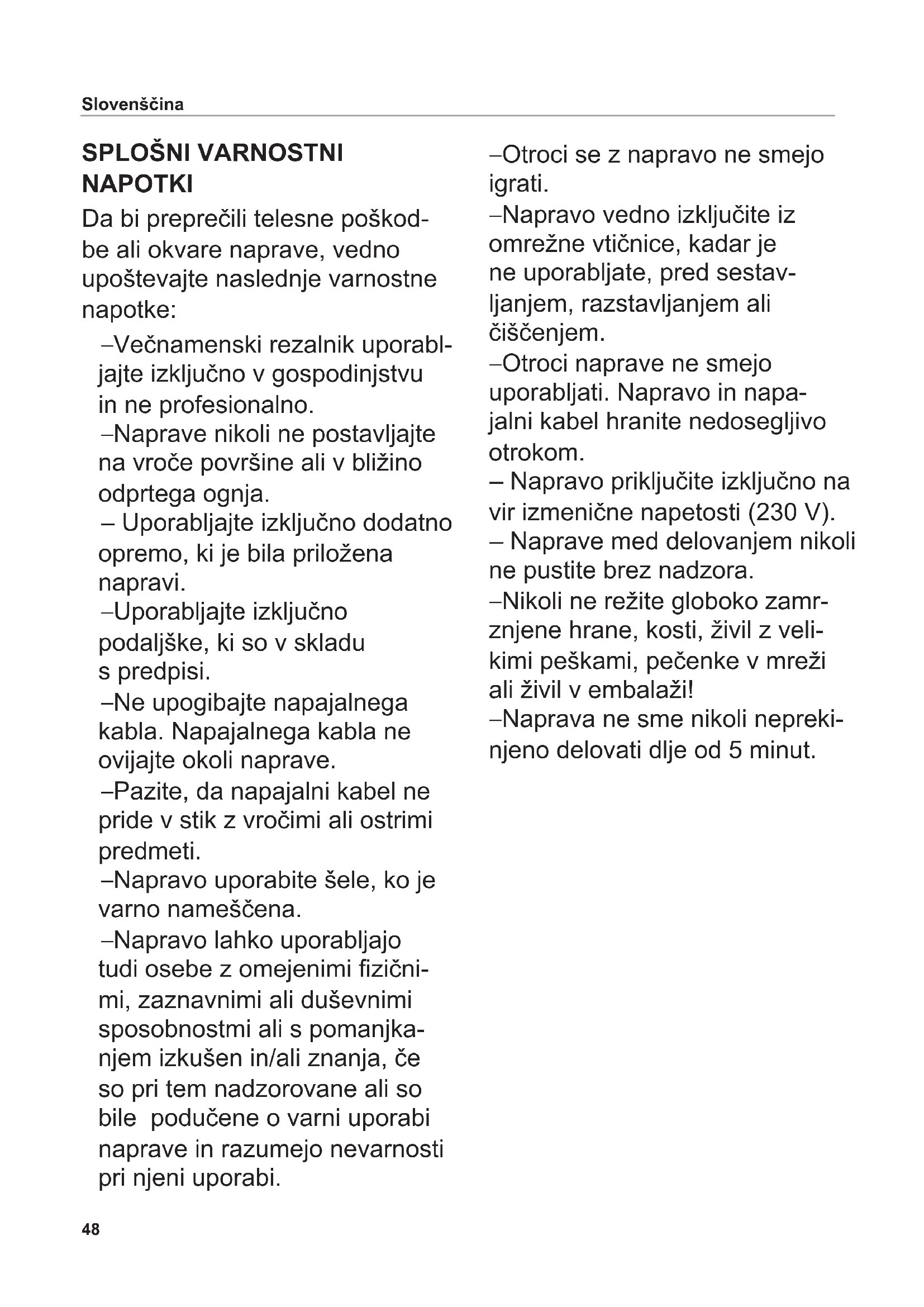 NAPOTKI Da bi preprečili telesne poškod- be ali okvare naprave, vedno upoštevajte naslednje varnostne napotke: – Večnamenski rezalnik uporabl- jajte izključno v gospodinjstvu in ne profesionalno. – Naprave nikoli ne postavljajte na vroče površine ali v bližino odprtega ognja. – Uporabljajte izključno dodatno opremo, ki je bila priložena napravi. – Uporabljajte izključno podaljške, ki so v skladu s predpisi. – Ne upogibajte napajalnega kabla. Napajalnega kabla ne ovijajte okoli naprave. – Pazite, da napajalni kabel ne pride v stik z vročimi ali ostrimi predmeti. – Napravo uporabite šele, ko je varno nameščena. – Napravo lahko uporabljajo tudi osebe z omejenimi zični- mi, zaznavnimi ali duševnimi sposobnostmi ali s pomanjka- njem izkušen in/ali znanja, če so pri tem nadzorovane ali so bile podučene o varni uporabi naprave in razumejo nevarnosti pri njeni uporabi. – Otroci se z napravo ne smejo igrati. – Napravo vedno izključite iz omrežne vtičnice, kadar je ne uporabljate, pred sestav- ljanjem, razstavljanjem ali čiščenjem. – Otroci naprave ne smejo uporabljati. Napravo in napa- jalni kabel hranite nedosegljivo otrokom. – Napravo priključite izključno na vir izmenične napetosti (230 V). – Naprave med delovanjem nikoli ne pustite brez nadzora. – Nikoli ne režite globoko zamr- znjene hrane, kosti, živil z veli- kimi peškami, pečenke v mreži ali živil v embalaži! – Naprava ne sme nikoli nepreki- njeno delovati dlje od 5 minut.49 Slovenščina Nevarnost električnega udara – V primeru motenj delovanja, pred vsakim čiščenjem ali če naprave ne uporabljate, vedno izključite električni vtikač iz omrežne vtičnice. Pri tem ne vlecite za napajalni kabel, tem- več za električni vtikač. – Naprave nikoli ne potapljajte v vodo. Nikoli je ne izpostavljaj- te dežju ali drugi vlagi. Če bi naprava vseeno padla v vodo, najprej izključite elek- trični vtikač iz omrežne vtičnice in šele nato vzemite napravo iz vode. V takšnem primeru jo naj pred ponovno uporabo pregleda pooblaščeni servis. – Naprave nikoli ne uporabljajte z vlažnimi rokami. Naprave ne uporabljajte, če je vlažna ali mokra ali če stojite na vlažnih tleh. Ne uporabljajte je na pro- stem. – Če je kateri od delov naprave poškodovan, jo takoj prenehaj- te uporabljati. Celotno napravo pošljite servisni službi ritter. – Če je poškodovan napajalni kabel, ga sme, da bi se izognili nevarnosti, zamenjati samo proizvajalec, njegova servisna služba ali podobno usposoblje- na oseba. Nevarnost telesnih poškodb – Naprave ne uporabljajte brez sani za živilo ali držala za živilo, razen če velikost in oblika živi- la, ki ga režete, tega ne dopu- ščata. – Pred zamenjavo dodatne opreme ali dodatnih delov, ki se med uporabo premikajo, napravo izklopite in izključite iz omrežne vtičnice. – Okroglo rezilo je zelo ostro. – Med delovanjem naprave se nikoli ne dotikajte okroglega rezila! – Pred čiščenjem napravo izklo- pite, izključite električni vtikač iz omrežne vtičnice in zavrtite gumb za nastavitev debeline rezanja v položaj „0“. – Okroglo rezilo se po izklopu še nekaj časa vrti.50 Razgrnite grake na sprednji in zadnji platnici. Pred prvo uporabo skrbno prebe- rite navodila za uporabo. Navodila za uporabo shranite in jih priložite napravi, če jo posredujete naprej. NAMEN Večnamenski rezalnik je name- njen rezanju živil. Neustrezna ali napačna uporaba lahko povzroči hude telesne poškodbe ali okvare naprave. V takšnih primerih prenehata veljati garancija in jamstvo. PRVA UPORABA Priprava Napravo previdno vzemite iz embalaže. Odstranite vse dele embalaže in jih shranite skupaj z embalažo. Napravo očistite, preden pride v stik z živili (glejte ČIŠČENJE). Postavitev naprave