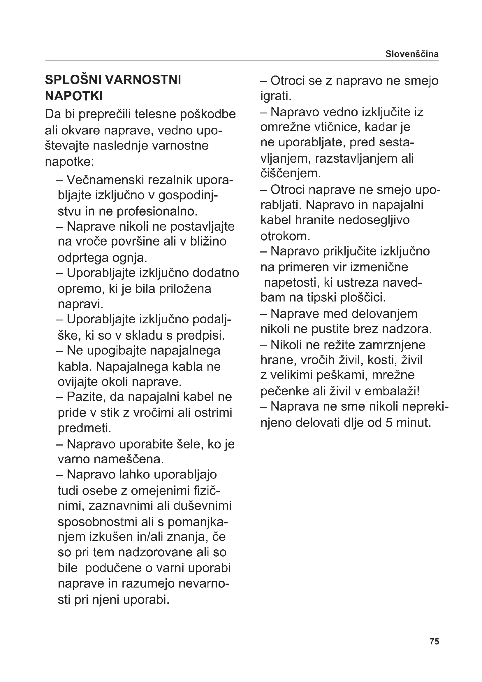 NAPOTKI Da bi preprečili telesne poškodbe ali okvare naprave, vedno upo- števajte naslednje varnostne napotke: – Večnamenski rezalnik upora- bljajte izključno v gospodinj- stvu in ne profesionalno. – Naprave nikoli ne postavljajte na vroče površine ali v bližino odprtega ognja. – Uporabljajte izključno dodatno opremo, ki je bila priložena napravi. – Uporabljajte izključno podalj- ške, ki so v skladu s predpisi. – Ne upogibajte napajalnega kabla. Napajalnega kabla ne ovijajte okoli naprave. – Pazite, da napajalni kabel ne pride v stik z vročimi ali ostrimi predmeti. – Napravo uporabite šele, ko je varno nameščena. – Napravo lahko uporabljajo tudi osebe z omejenimi zič- nimi, zaznavnimi ali duševnimi sposobnostmi ali s pomanjka- njem izkušen in/ali znanja, če so pri tem nadzorovane ali so bile podučene o varni uporabi naprave in razumejo nevarno- sti pri njeni uporabi. – Otroci se z napravo ne smejo igrati. – Napravo vedno izključite iz omrežne vtičnice, kadar je ne uporabljate, pred sesta- vljanjem, razstavljanjem ali čiščenjem. – Otroci naprave ne smejo upo- rabljati. Napravo in napajalni kabel hranite nedosegljivo otrokom. – Napravo priključite izključno na primeren vir izmenične napetosti, ki ustreza naved- bam na tipski ploščici. – Naprave med delovanjem nikoli ne pustite brez nadzora. – Nikoli ne režite zamrznjene hrane, vročih živil, kosti, živil z velikimi peškami, mrežne pečenke ali živil v embalaži! – Naprava ne sme nikoli nepreki- njeno delovati dlje od 5 minut.76 Slovenščina Nevarnost električnega udara – V primeru motenj delovanja, pred vsakim čiščenjem ali če naprave ne uporabljate, vedno izključite električni vtikač iz omrežne vtičnice. Pri tem ne vlecite za napajalni kabel, tem- več za električni vtikač. – Naprave nikoli ne potapljajte v vodo. Nikoli je ne izposta- vljajte dežju ali drugi vlagi. Če bi naprava vseeno padla v vodo, najprej izključite električni vtikač iz omrežne vtičnice in šele nato vzemite napravo iz vode. V takšnem primeru jo naj pred ponovno uporabo pregleda pooblaščeni servis. – Naprave nikoli ne uporabljajte z vlažnimi rokami. Naprave ne uporabljajte, če je vlažna ali mokra ali če stojite na vlažnih tleh. Ne uporabljajte je na prostem. – Če je kateri od delov naprave poškodovan, jo takoj preneha- jte uporabljati in se obrnite na servisno službo podjetja ritter. – Če je poškodovan napajalni kabel, ga sme, da bi se izognili nevarnosti, zamenjati samo proizvajalec, njegova servisna služba ali podobno usposo- bljena oseba. Nevarnost telesnih poškodb – Naprave ne uporabljajte brez sani za živilo ali držala za živilo, razen če velikost in oblika živila, ki ga režete, tega ne dopuščata. – Pred zamenjavo dodatne opreme ali dodatnih delov, ki se med uporabo premikajo, napravo izklopite in izključite iz omrežne vtičnice. – Okroglo rezilo je zelo ostro. – Med delovanjem naprave se nikoli ne dotikajte okroglega rezila! – Pred čiščenjem napravo izklo- pite, izključite električni vtikač iz omrežne vtičnice in zavrtite gumb za nastavitev debeline rezanja v položaj „0“. – Okroglo rezilo se po izklopu še nekaj časa vrti.77 Razgrnite grake na sprednji in zadnji platnici. Pred prvo uporabo skrbno prebe- rite navodila za uporabo. Navodila za uporabo shranite in jih priložite napravi, če jo posredujete naprej. Najnovejša navodila za uporabo so na voljo tudi na spletnem naslovu www.ritterwerk.de. NAMEN Večnamenski rezalnik je name- njen rezanju živil. Rezalnik je primeren za stik s hrano. Neustrezna ali napačna uporaba lahko povzroči hude telesne poškodbe ali okvare naprave. V takšnih primerih prenehata veljati garancija in jamstvo. PRVA UPORABA Priprava Napravo previdno vzemite iz embalaže. Odstranite vse dele embalaže in jih shranite skupaj z embalažo. Napravo očistite, preden pride v stik z živili (glejte ČIŠČENJE). Postavitev naprave