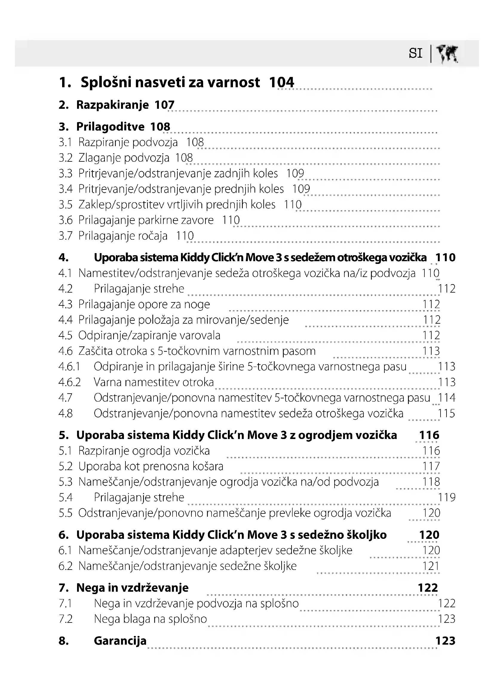 OPOZORILO Otroka nikoli ne puščajte nenadzorovanega. OPOZORILO Pred uporabo preverite, ali so vsi zaklepni me- hanizmi aktivirani. OPOZORILO V izogib poškodbam poskrbite, da otrok med razpiranjem in zlaganjem izdelka ni v bližini. OPOZORILO Pazite tudi, da v premične dele ne ujamete okončin. OPOZORILO Otroku ne dovolite, da bi se igral z izdelkom. OPOZORILO Takoj, ko lahko otrok samostojno sedi, začnite uporabljati varnostni pas. OPOZORILO Sedež otroškega vozička ni primeren za otroke, mlajše od 6 mesecev. OPOZORILO Vedno uporabljajte zadrževalni sistem. 105SI