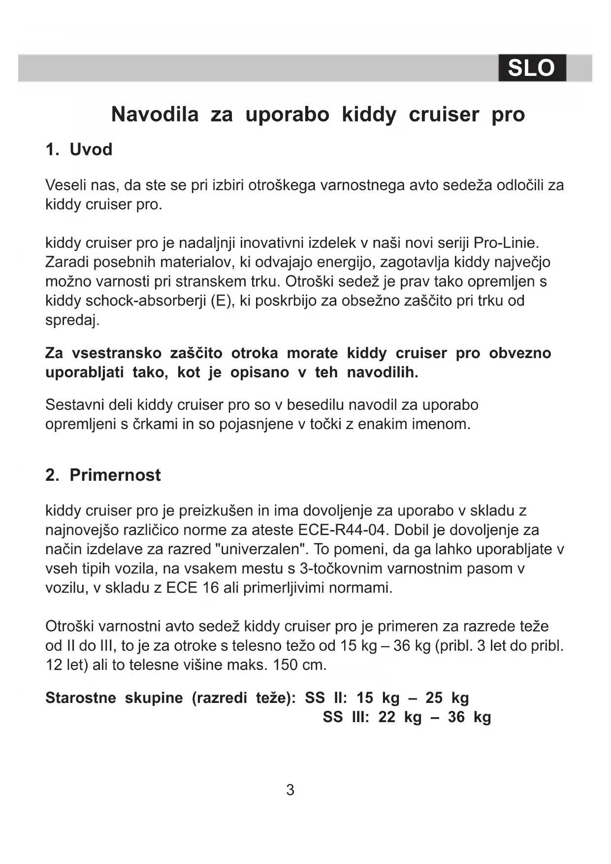 Veseli nas, da ste se pri izbiri otroškega varnostnega avto sedeža odločili za kiddy cruiser pro. kiddy cruiser pro je nadaljnji inovativni izdelek v naši novi seriji Pro-Linie. Zaradi posebnih materialov, ki odvajajo energijo, zagotavlja kiddy največjo možno varnosti pri stranskem trku. Otroški sedež je prav tako opremljen s kiddy schock-absorberji (E), ki poskrbijo za obsežno zaščito pri trku od spredaj. Za vsestransko zaščito otroka morate kiddy cruiser pro obvezno uporabljati tako, kot je opisano v teh navodilih. Sestavni deli kiddy cruiser pro so v besedilu navodil za uporabo opremljeni s črkami in so pojasnjene v točki z enakim imenom.