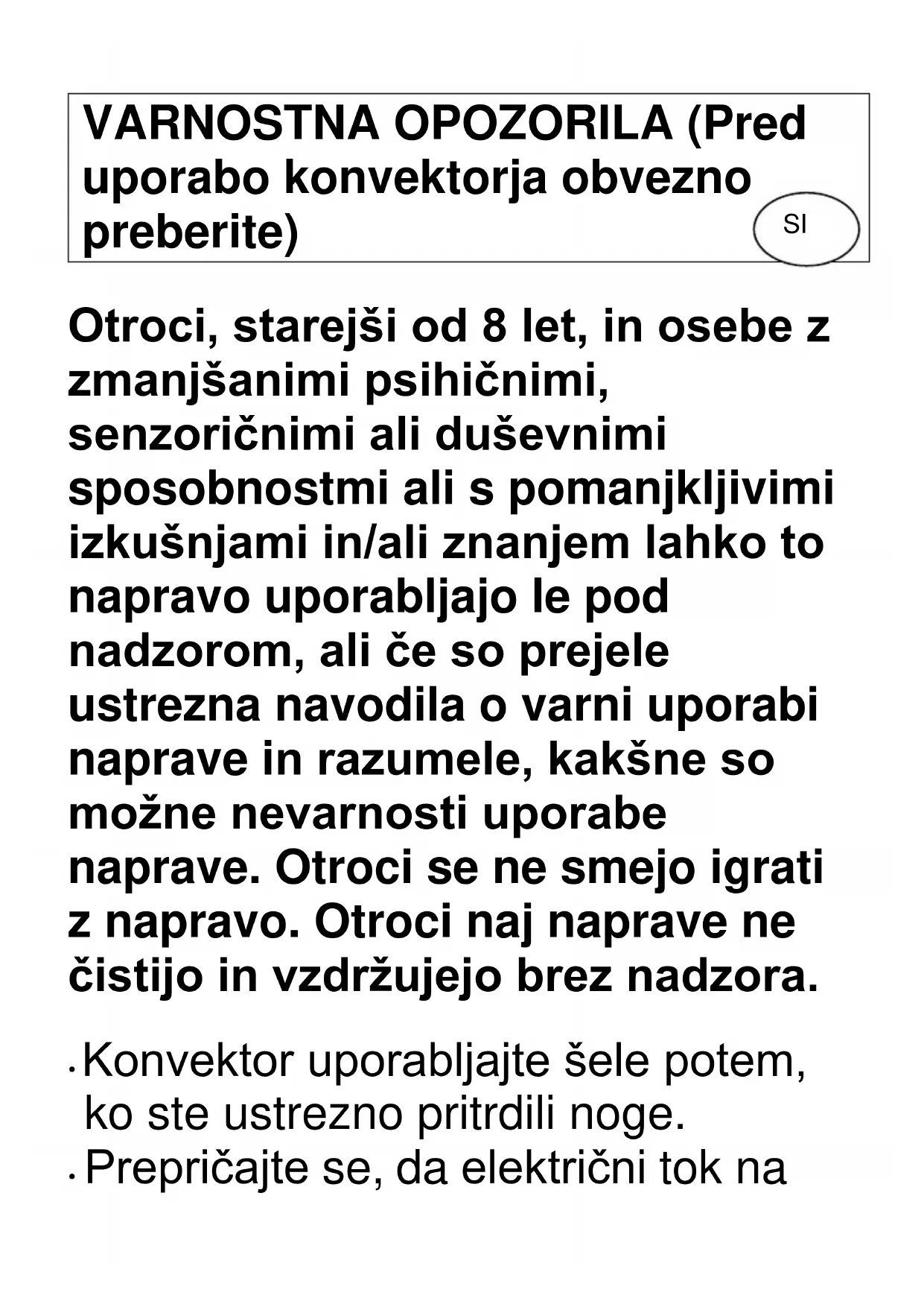 Otroci, starejši od 8 let, in osebe z zmanjšanimi psihičnimi, senzoričnimi ali duševnimi sposobnostmi ali s pomanjkljivimi izkušnjami in/ali znanjem lahko to napravo uporabljajo le pod nadzorom, ali če so prejele ustrezna navodila o varni uporabi naprave in razumele, kakšne so možne nevarnosti uporabe naprave. Otroci se ne smejo igrati z napravo. Otroci naj naprave ne čistijo in vzdržujejo brez nadzora. Konvektor uporabljajte šele potem, ko ste ustrezno pritrdili noge. Prepričajte se, da električni tok na SIvtičnici, na katero je priključen konvektor, ustreza podatkom na nalepki izdelka in da ima vtičnica zemeljski vod. Omrežnega kabla ne pustite v bližini vročega konvektorja! Konvektorja nikoli ne postavite v bližino vlažnih prostorov oziroma vodnih virov, ker lahko pade v kopalno kad ali druge posode, napolnjene z vodo. Nikoli ne uporabljajte konvektorja na prostem. Ne prekrivajte odvajalne mreže ali odprtin za dovod zraka konvektorja. Konvektorja ne postavljajte na preprogo iz mehkih, gostih tkanin. Zaradi preprečitve nevarnosti požara se vedno prepričajte, da konvektor stoji na stabilni in ravni površini, ne postavljajte ga v bližino zaves alipohištva. Konvektorja ne postavite pred ali tik pod stensko vtičnico. Ne vtikajte predmetov v odprtine za dovod toplega zraka ali skozi mrežo konvektorja. Konvektorja ne uporabljajte v prostorih, kjer se nahajajo gorljive tekočine ali dim. Pri uporabi konvektorja je treba posebno pozornost nameniti otrokom in invalidnim oz. prizadetim osebam. Nevarnost poškodb! Pri prestavljanju konvektorja z enega mesta na drugega vedno izvlecite vtikač. Konvektorja ne uporabljajte, če je omrežni kabel poškodovan. V tem primeru ga mora zamenjati pooblaščeni servis ali druga kvalificirana oseba. Če jepoškodovan vtikač, preberite navodila v zvezi z zamenjavo vtikača.