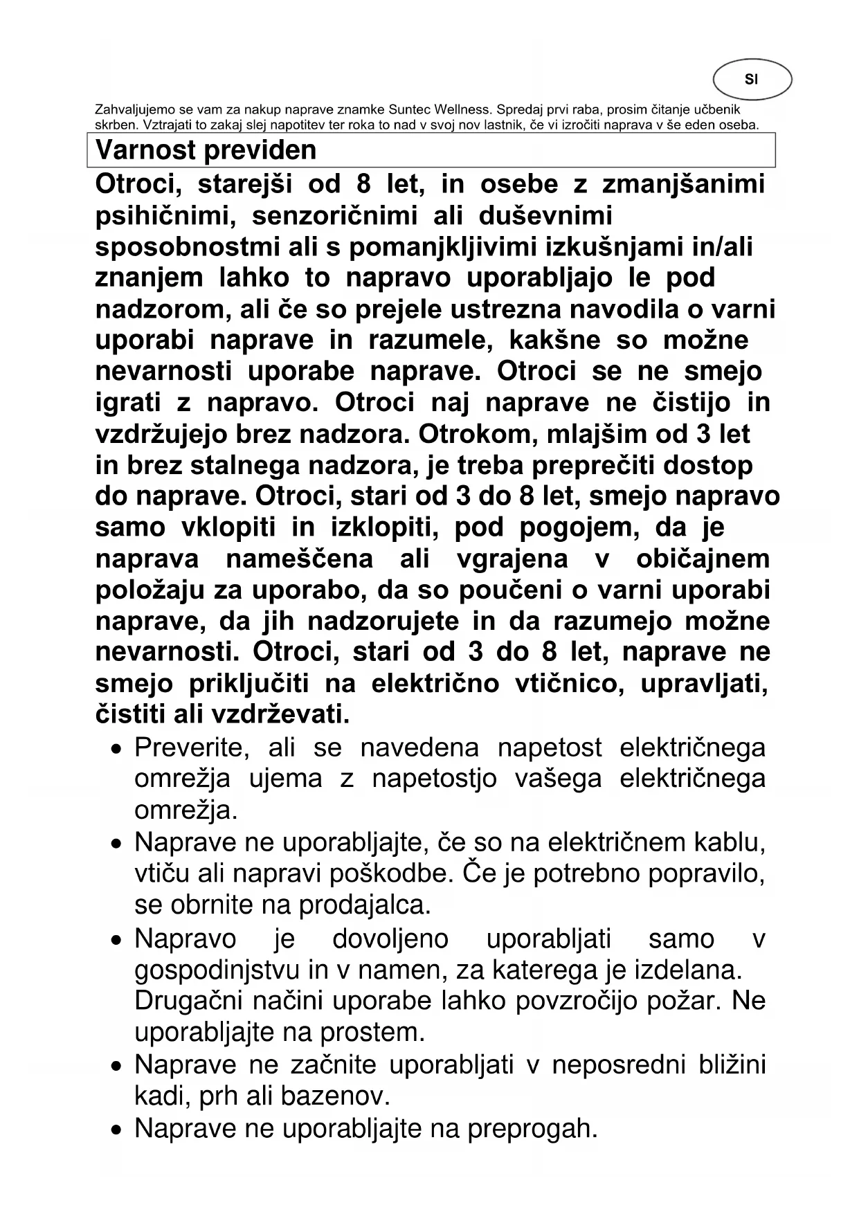 Heat Block PTC SUNTEC WELLNESS GMBH / HOLZSTRASSE 2 / 40221 DÜSSELDORF / GERMANYZahvaljujemo se vam za nakup naprave znamke Suntec Wellness. Spredaj prvi raba, prosim čitanje učbenik skrben. Vztrajati to zakaj slej napotitev ter roka to nad v svoj nov lastnik, če vi izročiti naprava v še eden oseba. Varnost previden Otroci, starejši od 8 let, in osebe z zmanjšanimi psihičnimi, senzoričnimi ali duševnimi sposobnostmi ali s pomanjkljivimi izkušnjami in/ali znanjem lahko to napravo uporabljajo le pod nadzorom, ali če so prejele ustrezna navodila o varni uporabi naprave in razumele, kakšne so možne nevarnosti uporabe naprave. Otroci se ne smejo igrati z napravo. Otroci naj naprave ne čistijo in vzdržujejo brez nadzora. Otrokom, mlajšim od 3 let in brez stalnega nadzora, je treba preprečiti dostop do naprave. Otroci, stari od 3 do 8 let, smejo napravo samo vklopiti in izklopiti, pod pogojem, da je naprava nameščena ali vgrajena v običajnem položaju za uporabo, da so poučeni o varni uporabi naprave, da jih nadzorujete in da razumejo možne nevarnosti. Otroci, stari od 3 do 8 let, naprave ne smejo priključiti na električno vtičnico, upravljati, čistiti ali vzdrževati.