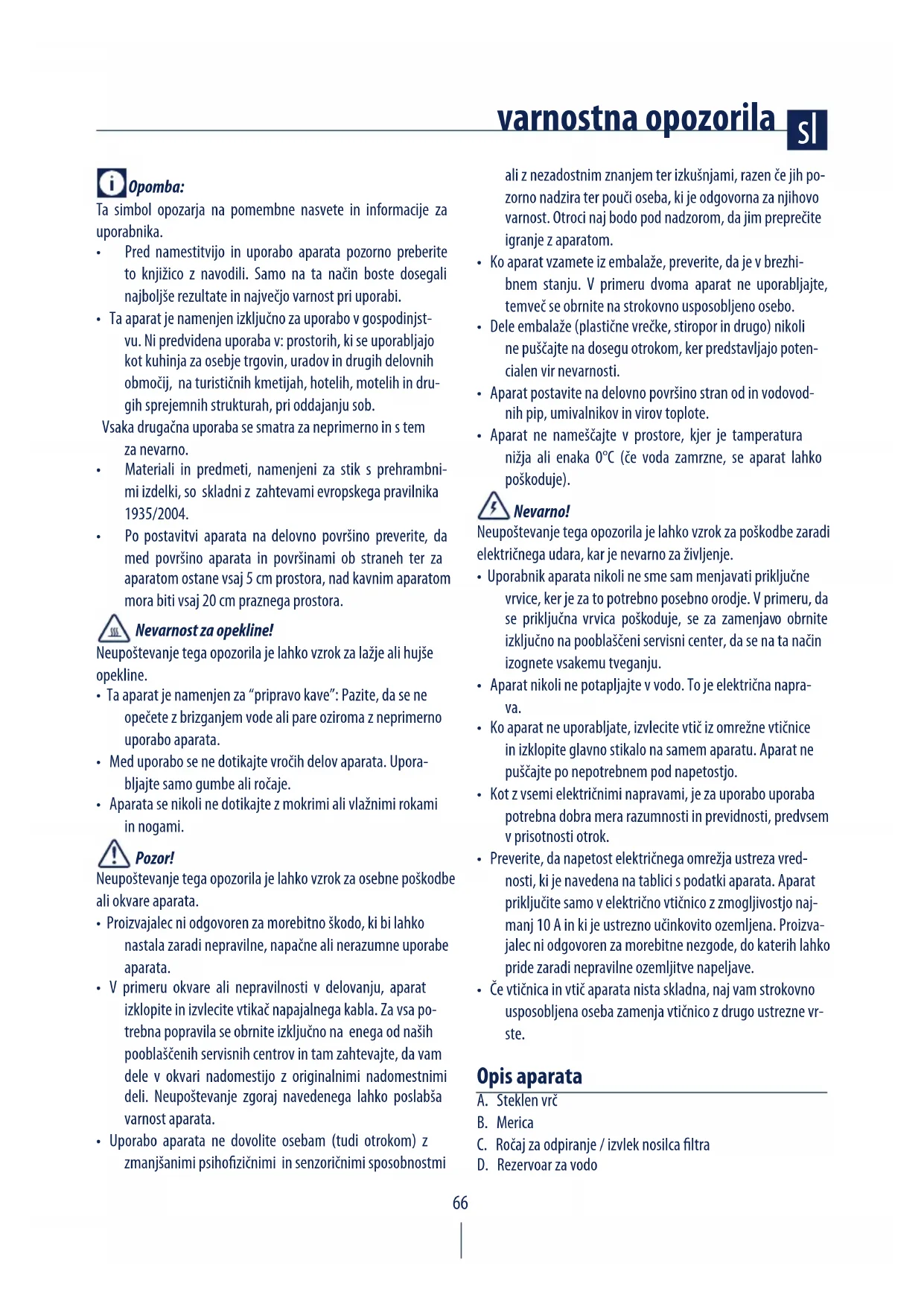 - Ta aparat je namenjen za “pripravo kave”: Pazite, da se ne opečete z brizganjem vode ali pare oziroma z neprimerno uporabo aparata.