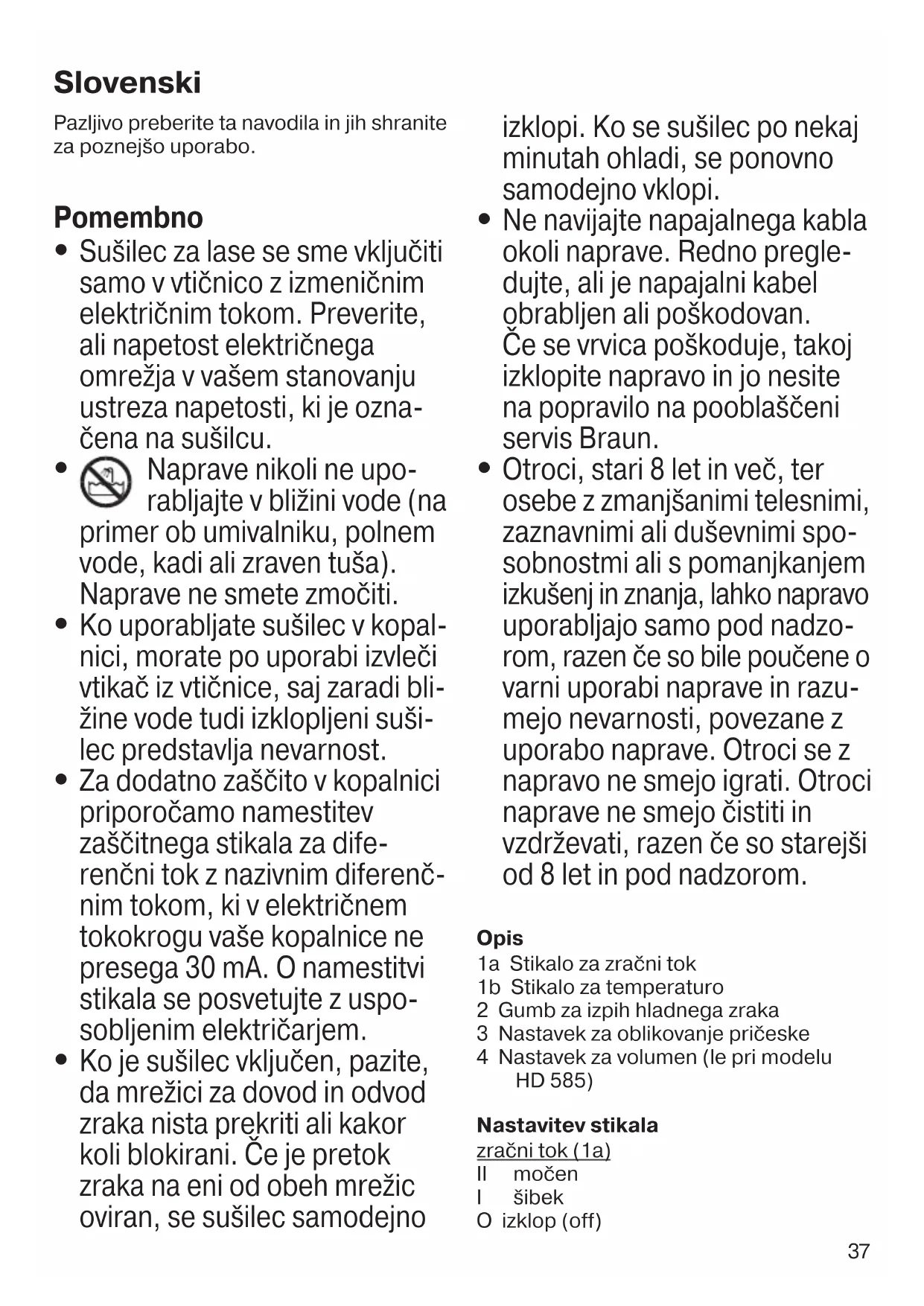 Otroci, stari 8 let in več, ter osebe z zmanjšanimi telesnimi, zaznavnimi ali duševnimi spo- sobnostmi ali s pomanjkanjem izkušenj in znanja, lahko napravo uporabljajo samo pod nadzo- rom, razen če so bile poučene o varni uporabi naprave in razu- mejo nevarnosti, povezane z uporabo naprave. Otroci se z napravo ne smejo igrati. Otroci naprave ne smejo čistiti in vzdrževati, razen če so starejši od 8 let in pod nadzorom. Opis 1a Stikalo za zračni tok 1b Stikalo za temperaturo 2 Gumb za izpih hladnega zraka 3 Nastavek za oblikovanje pričeske 4 Nastavek za volumen (le pri modelu HD 585) Nastavitev stikala zračni tok (1a) II močen I šibek O izklop (off) Slovenski 91163341_HD_580-585_MN_HD_580-585_S4-66.indd 37 31.10.16 10:2438 Temperatura (1b) III visoka II srednja I šibka Izpih hladnega zraka Za utrjevanje pričeske s hladnim zračnim tokom pritisnite tipko izpih hladnega zraka (cool shot) (2). Nastavek za oblikovanje pričeske Za hitro in lahko sušenje (3). Uporaba nastavka za volumen Za ustvarjanje volumna ali oblikovanje naravnih kodrov uporabite nastavek za volumen (4), ki ga pritrdite na zračni izhod. Preverite, ali se je zaskočil na svoje mesto. Kratki in srednje dolgi lasje (A): Če želite pri oblikovanju las doseči večji volumen in lase ob lasišču dvigniti, z majhnimi krožnimi gibi premikajte sušilec tako, da se paličice nastavka nežno doti- kajo lasišča. Postopek ponavljajte po celotnem lasišču. Dolgi lasje (B): Najprej posušite lasne konice, tako da jih polagate med paličice nastavka. Nato z nastavkom lase previdno dvignite in jih zadržite. Postopek ponavljajte po celot- nem lasišču. Zaključite z nežnimi krožnimi gibi sušilca tako, da se paličice nežno dotikajo vašega lasišča in pričeska bo dobila lepo obliko. Odlaganje Naprava vsebuje elektronske dele, ki jih je mogoče reciklirati. Varujte okolje in naprave ne odvrzite med gospodinjske odpadke. Odnesite jo na ustrezno zbirno mesto. Pridržujemo si pravico do sprememb brez predhodnega obvestila. Garancijski list Za izdelek velja dveletna garancija, ki začne veljati z datumom izročitve blaga. Proizvajalec jamči, da bo izdelek deloval v garancijskem roku ob pravilni uporabi v skladu z njegovim namenom in priloženimi navodili. V garancijski dobi bomo brezplačno odpravili vse okvare izdelka, ki so posledica napak v materialu ali izdelavi, tako da vam bomo izdelek po naši presoji popravili ali v celoti zamenjali. Če pooblaščeni servis vašega izdelka ne popravi v 45 dneh, imate pravico zahtevati nov izdelek. Za sprejem v reklamacijo se šteje dan, ko je izdelek sprejet v pooblaščeni servis, pri prodajalcu(distributerju) ali v trgovino, kjer ste izdelek kupili. Čas zagotavljanja servisa, vzdrževanja, nadomestnih delov in priklopnih aparatov je 3 leta po preteku garancijskega roka. Popravila na domu zaradi zahtevnosti in neprenosljivosti sodobne servisne opreme in razpoložljivosti rezervnih delov niso mogoča. Garancija velja na območju Republike Slovenije, pa tudi v vseh državah, kjer izdelek dobavlja podjetje Braun ali njegov pooblaščeni distributer. Garancija ne izključuje pravic potrošnika, ki izhajajo iz odgovornosti prodajalca za napake na blagu. Garancija ne velja: – Za okvare, ki so posledica nepravilne uporabe, normalne obrabe ali rabe oziroma napake, ki imajo zanemarljiv učinek na vrednost in delovanje izdelka. – Ob vsakem posegu nepooblaščene osebe ali kakršnekoli druge predelave izdelka in če pri popravilu niso uporabljeni originalni Braunovi rezervni deli. 91163341_HD_580-585_MN_HD_580-585_S4-66.indd 38 31.10.16 10:2439 Za popravilo v garancijski dobi celotno napravo skupaj z računom in/ali izpolnjenim garancijskim listom odnesite ali pošljite na pooblaščeni servisni center Braun: JEŽEK SERVIS D.O.O. , Cesta 24. Junija 2, 1231 Ljubljana Tel. št.: +386 1 561 66 30 E-mail: jezektrg.servis@siol.net Potrošnik lahko zahtevo za popravilo v garancijski dobi za celotno napravo, skupaj z računom in/ali izpolnjenim garancijskim listom, prav tako uveljavlja tudi pri prodajalcu ali pri proizvajalcu (distributerju). Za dodatne informacije smo vam na voljo na brezplačni telefonski številki 080 2822. Distributer: Orbico, d. o. o., Verovškova ul. 72, 1000 Ljubljana Proizvajalec: Braun GmbH, Frankfurter Str. 145, 61476 Kronberg, Nemčija 91163341_HD_580-585_MN_HD_580-585_S4-66.indd 39 31.10.16 10:2440 Kérjük, hogy figyelmesen olvassa el ezt az útmutatót, és őrizze meg, mert később szüksége lehet rá. Fontos