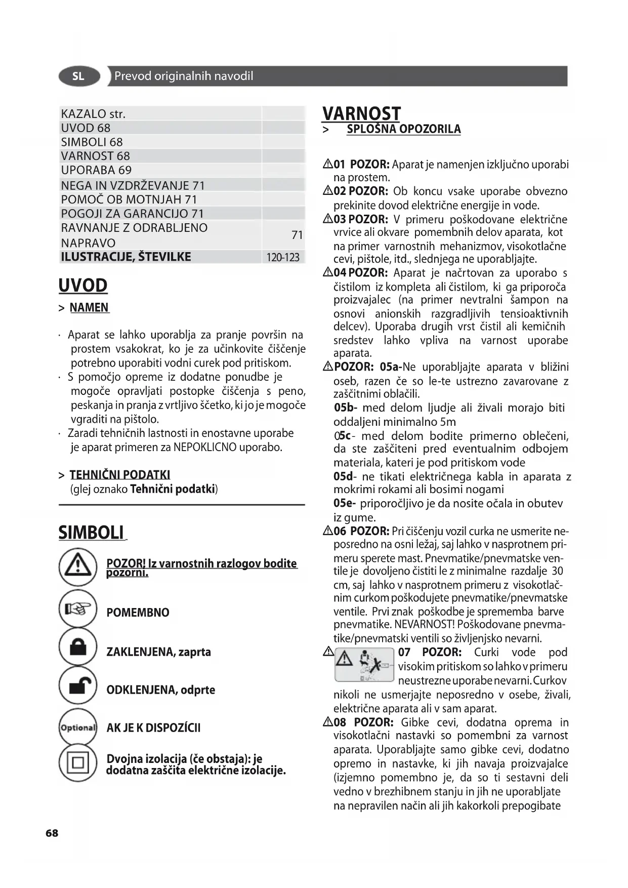 (glej oznako Tehnični podatki) SIMBOLI POZOR! Iz varnostnih razlogov bodite pozorni. POMEMBNO ZAKLENJENA, zaprta ODKLENJENA, odprte