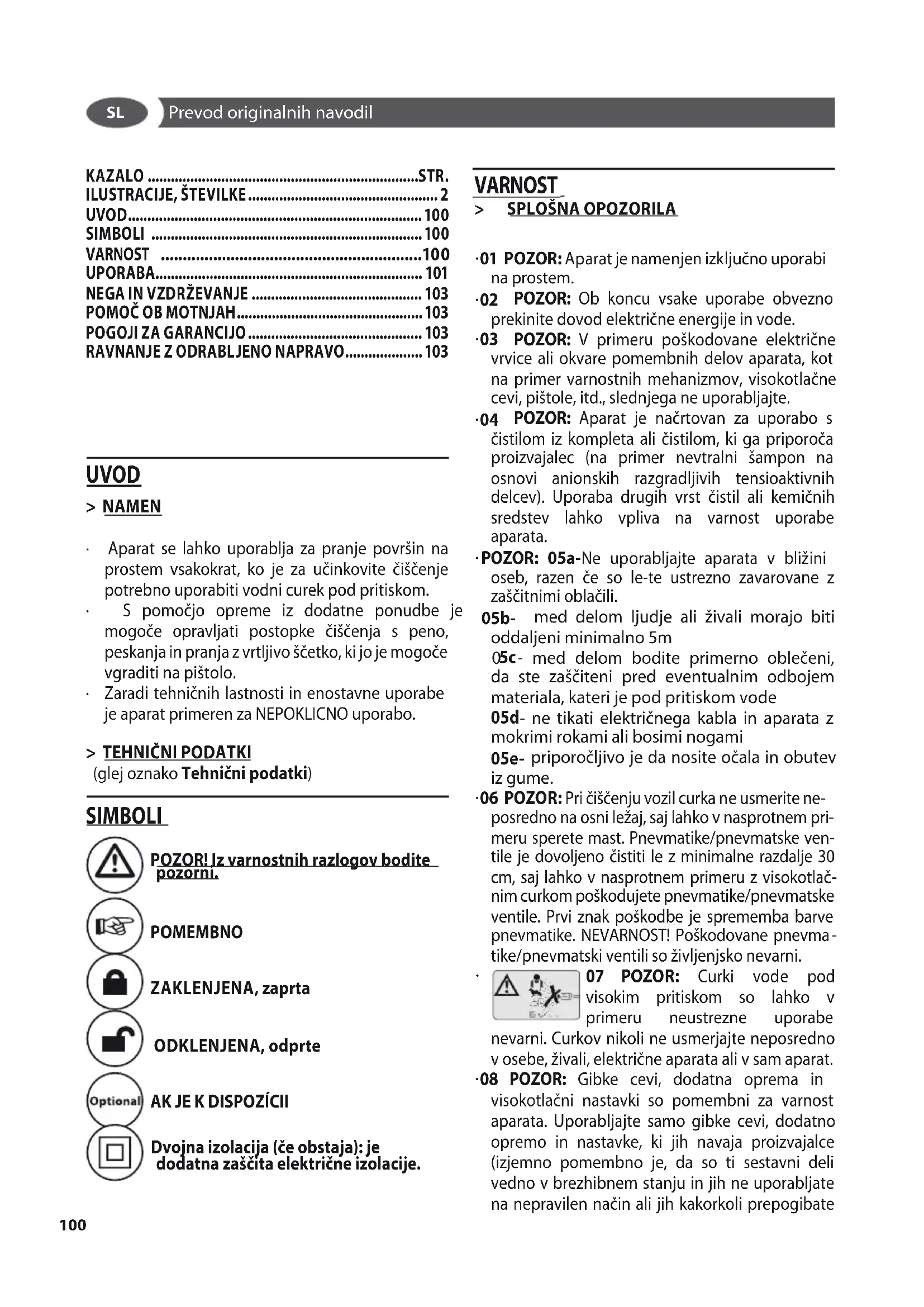 - 03 POZOR: V primeru poškodovane električne vrvice ali okvare pomembnih delov aparata, kot na primer varnostnih mehanizmov, visokotlačne cevi, pištole, itd., slednjega ne uporabljajte.