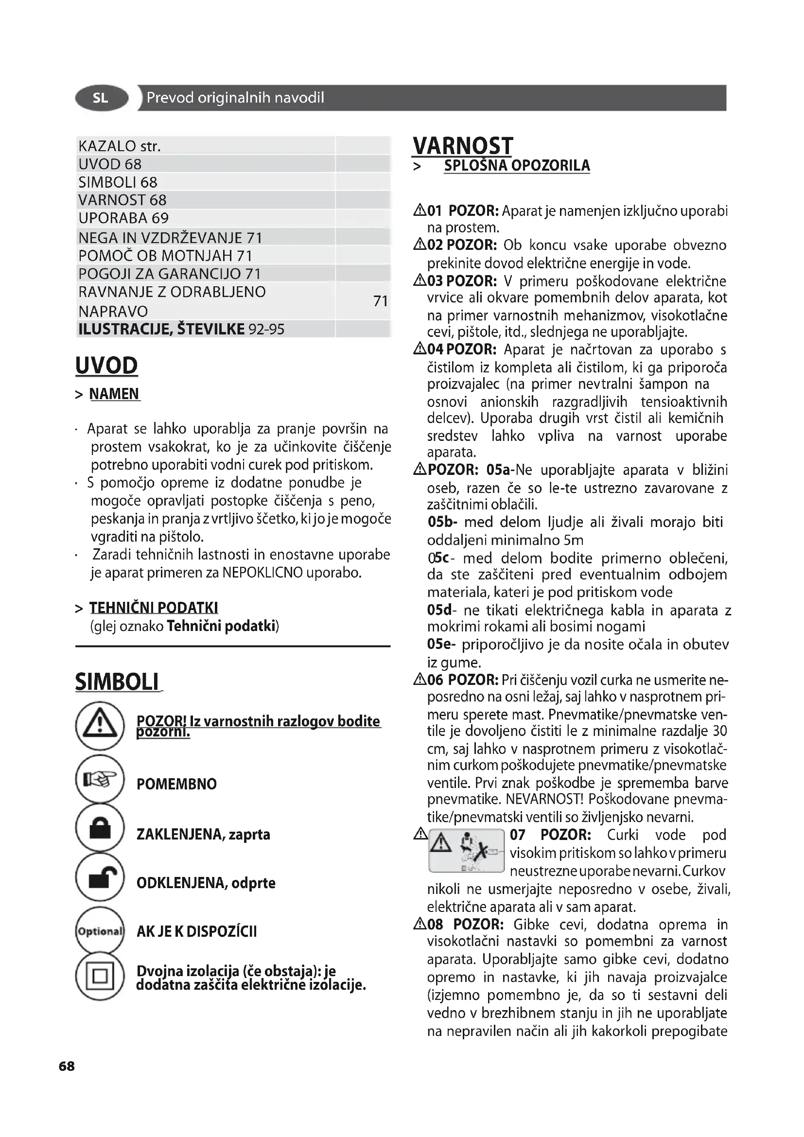 - 08 POZOR: Gibke cevi, dodatna oprema in visokotlačni nastavki so pomembni za varnost aparata. Uporabljajte samo gibke cevi, dodatno opremo in nastavke, ki jih navaja proizvajalce (izjemno pomembno je, da so ti sestavni deli vedno v brezhibnem stanju in jih ne uporabljate na nepravilen način ali jih kakorkoli prepogibateSL