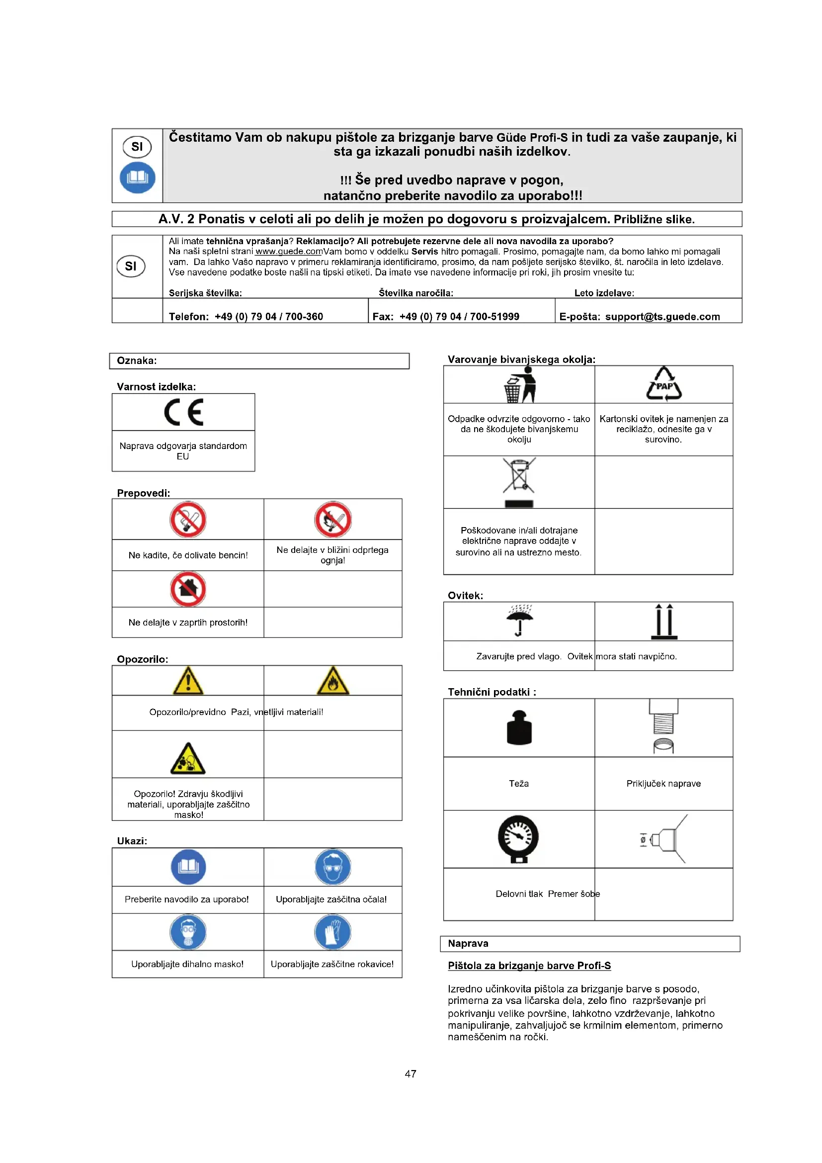 46SI Čestitamo Vam ob nakupu pištole za brizganje barve Güde Profi-S in tudi za vaše zaupanje, ki sta ga izkazali ponudbi naših izdelkov. !!! Še pred uvedbo naprave v pogon, natančno preberite navodilo za uporabo!!! A.V. 2 Ponatis v celoti ali po delih je možen po dogovoru s proizvajalcem. Približne slike.