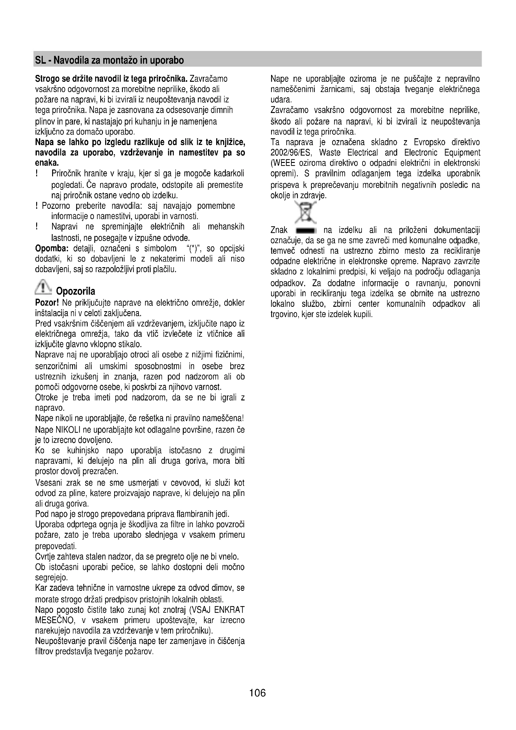 Ukoliko rasveta ne funkcioniše, kontrolišite da li ste pravilno postavili lampe na njihovo mesto pre nego što pozovete servisnu službu radi asistencije.106 SL - Navodila za montažo in uporabo Strogo se držite navodil iz tega priročnika. Zavračamo vsakršno odgovornost za morebitne neprilike, škodo ali požare na napravi, ki bi izvirali iz neupoštevanja navodil iz tega priročnika. Napa je zasnovana za odsesovanje dimnih plinov in pare, ki nastajajo pri kuhanju in je namenjena izključno za domačo uporabo. Napa se lahko po izgledu razlikuje od slik iz te knjižice, navodila za uporabo, vzdrževanje in namestitev pa so enaka. ! Priročnik hranite v kraju, kjer si ga je mogoče kadarkoli pogledati. Če napravo prodate, odstopite ali premestite naj priročnik ostane vedno ob izdelku. ! Pozorno preberite navodila: saj navajajo pomembne informacije o namestitvi, uporabi in varnosti. ! Napravi ne spreminjajte električnih ali mehanskih lastnosti, ne posegajte v izpušne odvode. Opomba: detajli, označeni s simbolom “(*)”, so opcijski dodatki, ki so dobavljeni le z nekaterimi modeli ali niso dobavljeni, saj so razpoložljivi proti plačilu. Opozorila Pozor! Ne priključujte naprave na električno omrežje, dokler inštalacija ni v celoti zaključena. Pred vsakršnim čiščenjem ali vzdrževanjem, izključite napo iz električnega omrežja, tako da vtič izvlečete iz vtičnice ali izključite glavno vklopno stikalo. Naprave naj ne uporabljajo otroci ali osebe z nižjimi fizičnimi, senzoričnimi ali umskimi sposobnostmi in osebe brez ustreznih izkušenj in znanja, razen pod nadzorom ali ob pomoči odgovorne osebe, ki poskrbi za njihovo varnost. Otroke je treba imeti pod nadzorom, da se ne bi igrali z napravo. Nape nikoli ne uporabljajte, če rešetka ni pravilno nameščena! Nape NIKOLI ne uporabljajte kot odlagalne površine, razen če je to izrecno dovoljeno. Ko se kuhinjsko napo uporablja istočasno z drugimi napravami, ki delujejo na plin ali druga goriva, mora biti prostor dovolj prezračen. Vsesani zrak se ne sme usmerjati v cevovod, ki služi kot odvod za pline, katere proizvajajo naprave, ki delujejo na plin ali druga goriva. Pod napo je strogo prepovedana priprava flambiranih jedi. Uporaba odprtega ognja je škodljiva za filtre in lahko povzroči požare, zato je treba uporabo slednjega v vsakem primeru prepovedati. Cvrtje zahteva stalen nadzor, da se pregreto olje ne bi vnelo. Ob istočasni uporabi pečice, se lahko dostopni deli močno segrejejo. Kar zadeva tehnične in varnostne ukrepe za odvod dimov, se morate strogo držati predpisov pristojnih lokalnih oblasti. Napo pogosto čistite tako zunaj kot znotraj (VSAJ ENKRAT MESEČNO, v vsakem primeru upoštevajte, kar izrecno narekujejo navodila za vzdrževanje v tem priročniku). Neupoštevanje pravil čiščenja nape ter zamenjave in čiščenja filtrov predstavlja tveganje požarov. Nape ne uporabljajte oziroma je ne puščajte z nepravilno namešč enimi žarnicami, saj obstaja tveganje električnega udara. Zavračamo vsakršno odgovornost za morebitne neprilike, škodo ali požare na napravi, ki bi izvirali iz neupoštevanja navodil iz tega priročnika. Ta naprava je označena skladno z Evropsko direktivo 2002/96/ES, Waste Electrical and Electronic Equipment (WEEE oziroma direktivo o odpadni električni in elektronski opremi). S pravilnim odlaganjem tega izdelka uporabnik prispeva k preprečevanju morebitnih negativnih posledic na okolje in zdravje. Znak na izdelku ali na priloženi dokumentaciji označuje, da se ga ne sme zavreči med komunalne odpadke, temveč odnesti na ustrezno zbirno mesto za recikliranje odpadne električne in elektronske opreme. Napravo zavrzite skladno z lokalnimi predpisi, ki veljajo na področju odlaganja odpadkov. Za dodatne informacije o ravnanju, ponovni uporabi in recikliranju tega izdelka se obrnite na ustrezno lokalno službo, zbirni center komunalnih odpadkov ali trgovino, kjer ste izdelek kupili.107 Uporaba Napa je izdelana za uporabo v odzračevalni različici z zunanjim odvodom ali obtočni oz. filtracijski z notranjim obtokom. Odzračevalna različica Hlapi so usmerjeni navzven po odvodni cevi, ki je pritrjena na priključno prirobnico. Premer odvodne cevi mora biti enak premeru spojnega obročka. Pozor! Odvodna cev ni priložena napi in jo je potrebno kupiti ločeno. V horizontalnem odseku mora biti cev rahlo nagnjena navzgor (približno 10°), tako da zrak lažje izhaja navzven. Če je napa opremljena z oglenimi filtri, je slednje potrebno odstraniti. Povežite napo s cevmi in odprtinami z vodoravnim odtokom enakega premera kot je premer izhoda za zrak (spojna prirobnica). Uporaba cevi in odprtin z vodoravnim odtokom, ki imajo manjši premer, bo vplivala na zmanjšanje uèinkov sesanja in moèno poveèala hrupnost. Zato za tako delovanje odklanjamo vsakršno odgovornost. ! Cevovod naj bo dolg toliko, kolikor znaša najmanjša nujna dolžina. ! Cevovod naj ima čim manj krivin (največji kot upogiba: 90°). ! Izogibajte se izrazitim spremembam smeri cevovoda. ! Notranjost cevovoda naj bo čim bolj gladka. ! Material, iz katerega je izdelan cevovod, mora biti skladen z normativi. Obtočna različica Iz vsesanega zraka so pred ponovnim vnosom v prostor odstranjeni maščoba in neprijetne vonjave. Pri uporabi nape v tej izvedbi je potrebno namestiti dodatni filter na osnovi aktivnega oglja. Inštalacija Minimalna razdalja med podporno površino posod na kuhalni površini in spodnjim delom nape za kuhinjske prostore ne sme biti manjša od 50cm pri električnih štedilnikih in 65cm pri plinskih ali mešanih štedilnikih. Če je v navodilih za instalacijo plinskega kuhalnika napisana večja razdalja, jo je treba tudi upoštevati. Električna povezava Omrežna napetost mora ustrezati napetosti, navedeni na nalepki z lastnostmi, nameščeni v notranjosti nape. Če ima napa vtič, slednjega vstavite v vtičnico, ki je skladna z veljavnimi predpisi in se nahaja na takem mestu, ki bo dost