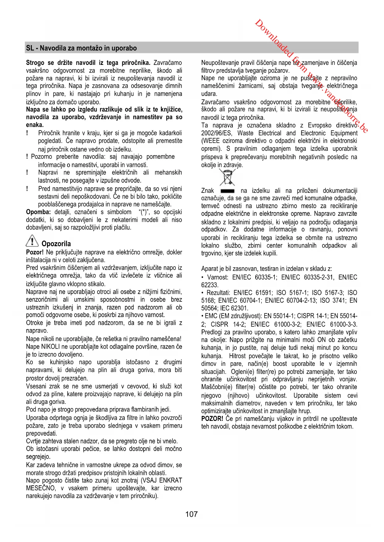 Downloaded from www.vandenborre.be107 SL - Navodila za montažo in uporabo Strogo se držite navodil iz tega priročnika. Zavračamo vsakršno odgovornost za morebitne neprilike, škodo ali požare na napravi, ki bi izvirali iz neupoštevanja navodil iz tega priročnika. Napa je zasnovana za odsesovanje dimnih plinov in pare, ki nastajajo pri kuhanju in je namenjena izključno za domačo uporabo. Napa se lahko po izgledu razlikuje od slik iz te knjižice, navodila za uporabo, vzdrževanje in namestitev pa so enaka. ! Priročnik hranite v kraju, kjer si ga je mogoče kadarkoli pogledati. Če napravo prodate, odstopite ali premestite naj priročnik ostane vedno ob izdelku. ! Pozorno preberite navodila: saj navajajo pomembne informacije o namestitvi, uporabi in varnosti. ! Napravi ne spreminjajte električnih ali mehanskih lastnosti, ne posegajte v izpušne odvode. ! Pred namestitvijo naprave se prepričajte, da so vsi njeni sestavni deli nepoškodovani. Če ne bi bilo tako, pokličite pooblaščenega prodajalca in naprave ne nameščajte. Opomba: detajli, označeni s simbolom “(*)”, so opcijski dodatki, ki so dobavljeni le z nekaterimi modeli ali niso dobavljeni, saj so razpoložljivi proti plačilu. Opozorila Pozor! Ne priključujte naprave na električno omrežje, dokler inštalacija ni v celoti zaključena. Pred vsakršnim čiščenjem ali vzdrževanjem, izključite napo iz električnega omrežja, tako da vtič izvlečete iz vtičnice ali izključite glavno vklopno stikalo. Naprave naj ne uporabljajo otroci ali osebe z nižjimi fizičnimi, senzoričnimi ali umskimi sposobnostmi in osebe brez ustreznih izkušenj in znanja, razen pod nadzorom ali ob pomoči odgovorne osebe, ki poskrbi za njihovo varnost. Otroke je treba imeti pod nadzorom, da se ne bi igrali z napravo. Nape nikoli ne uporabljajte, če rešetka ni pravilno nameščena! Nape NIKOLI ne uporabljajte kot odlagalne površine, razen če je to izrecno dovoljeno. Ko se kuhinjsko napo uporablja istočasno z drugimi napravami, ki delujejo na plin ali druga goriva, mora biti prostor dovolj prezračen. Vsesani zrak se ne sme usmerjati v cevovod, ki služi kot odvod za pline, katere proizvajajo naprave, ki delujejo na plin ali druga goriva. Pod napo je strogo prepovedana priprava flambiranih jedi. Uporaba odprtega ognja je škodljiva za filtre in lahko povzroči požare, zato je treba uporabo slednjega v vsakem primeru prepovedati. Cvrtje zahteva stalen nadzor, da se pregreto olje ne bi vnelo. Ob istočasni uporabi pečice, se lahko dostopni deli močno segrejejo. Kar zadeva tehnične in varnostne ukrepe za odvod dimov, se morate strogo držati predpisov pristojnih lokalnih oblasti. Napo pogosto čistite tako zunaj kot znotraj (VSAJ ENKRAT MESEČNO, v vsakem primeru upoštevajte, kar izrecno narekujejo navodila za vzdrževanje v tem priročniku). Neupoštevanje pravil čiščenja nape ter zamenjave in čiščenja filtrov predstavlja tveganje požarov. Nape ne uporabljajte oziroma je ne puščajte z nepravilno nameščenimi žarnicami, saj obstaja tveganje elektri čnega udara. Zavračamo vsakršno odgovornost za morebitne neprilike, škodo ali požare na napravi, ki bi izvirali iz neupoštevanja navodil iz tega priročnika. Ta naprava je označena skladno z Evropsko direktivo 2002/96/ES, Waste Electrical and Electronic Equipment (WEEE oziroma direktivo o odpadni električni in elektronski opremi). S pravilnim odlaganjem tega izdelka uporabnik prispeva k preprečevanju morebitnih negativnih posledic na okolje in zdravje. Znak na izdelku ali na priloženi dokumentaciji označuje, da se ga ne sme zavreči med komunalne odpadke, temveč odnesti na ustrezno zbirno mesto za recikliranje odpadne električne in elektronske opreme. Napravo zavrzite skladno z lokalnimi predpisi, ki veljajo na področju odlaganja odpadkov. Za dodatne informacije o ravnanju, ponovni uporabi in recikliranju tega izdelka se obrnite na ustrezno lokalno službo, zbirni center komunalnih odpadkov ali trgovino, kjer ste izdelek kupili. Aparat je bil zasnovan, testiran in izdelan v skladu z:
