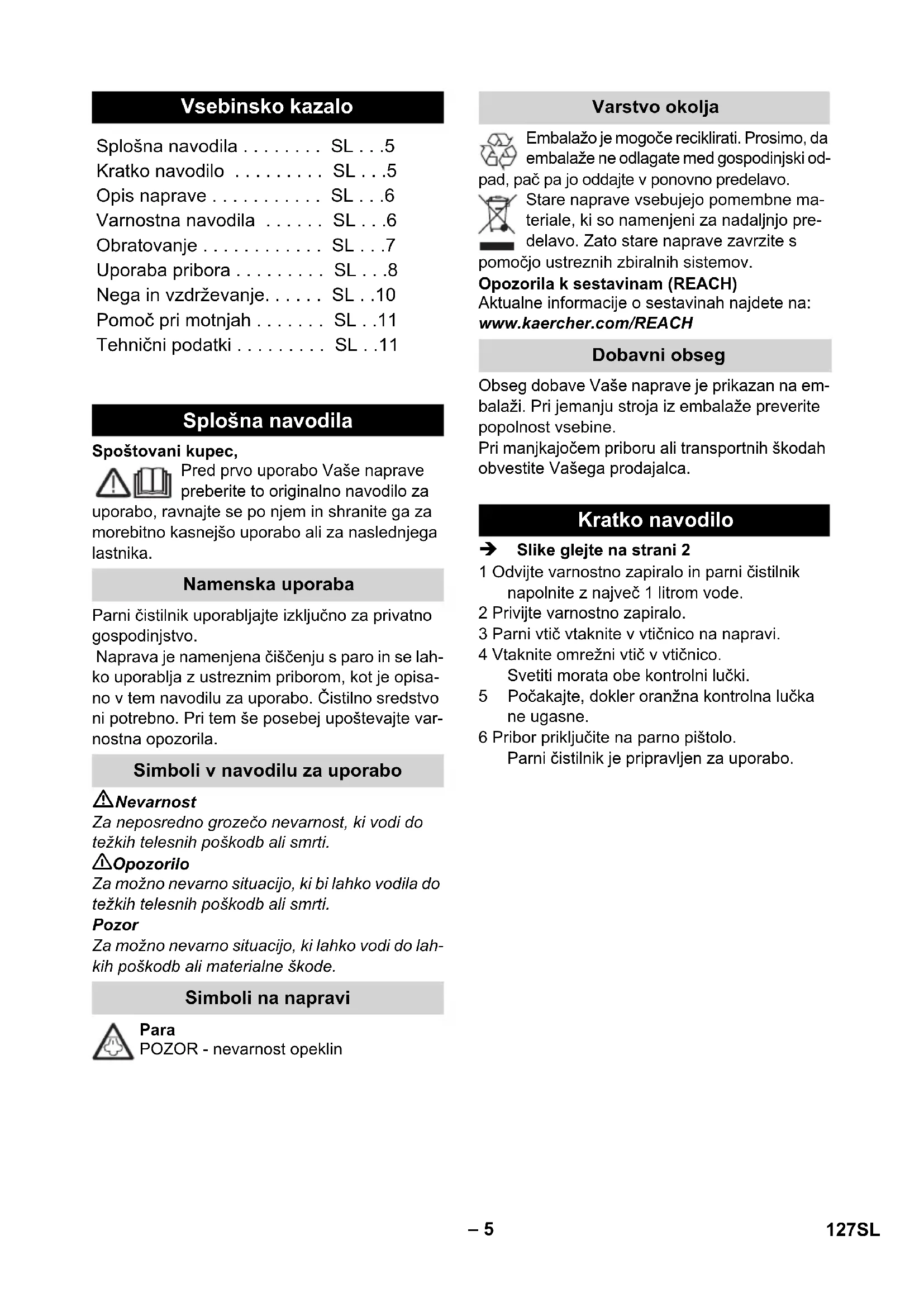- SL Splošna navodila Namenska uporaba Simboli v navodilu za uporabo Simboli na napravi Varstvo okolja Dobavni obseg Kratko navodilo 127SL– 6 V tem navodilu za uporabo je opisana maksimal- na oprema. Glede na model prihaja do razlik v obsegu dobave (glejte embalažo). Slike glejte na razklopni strani! Nevarnost Prepovedano je obratovanje v področjih, kjer obstaja nevarnost eksplozij. Pri uporabi naprave v nevarnih območjih je potrebno upoštevati ustrezne varnostne predpise. Naprave ne uporabljajte v plavalnih bazenih, ki vsebujejo vodo. Naprave se ne sme uporabljati za čiščenje električnih aparatov npr. pečic, kuhinjskih nap, mikrovalovnih pečic, televizorjev, luči, sušilnikov za lase, električnih grelcev itd. Pred uporabo preverite, ali sta naprava in pribor v brezhibnem stanju. Če stanje ni brezhibno, naprave ne smete uporabljati. Posebej preverite omrežni priključni kabel, varnostno zapiralo in gibko parno cev. Poškodovan omrežni priključni kabel naj po- oblaščeni uporabniški servis/elektro strokov- njak nemudoma zamenja. Poškodovano gibko parno cev nemudoma zamenjajte. Uporabljati se sme le takšna gi- bljiva parna cev (naročniško številko poglejte v seznamu nadomestnih delov), ki jo priporo- ča proizvajalec. Omrežnega vtiča in vtičnice nikoli ne prije- majte z mokrimi rokami. S paro ne obdelujte predmetov, ki vsebujejo zdravju nevarne snovi (npr. azbest). Nikoli se s kratke razdalje ne dotikajte z roko parnega curka in nikoli ga ne usmerjajte proti osebam ali živalim (nevarnost oparin). 몇 Opozorilo Stroj se sme priključevati samo na električni priključek, ki ga je elektroinštalater izvedel v skladu z IEC 60364. Stroj priključujte samo na izmenični tok. Nape- tost se mora ujemati s tipsko ploščico stroja. V vlažnih prostorih, kot je npr. kopalnica, uporabljajte napravo le na vtičnice z vme- snim FI-zaščitnim stikalom. Neprimerni podaljševalni kabli so lahko ne- varni. Uporabljajte samo pred škropljenjem zaščiten podaljševalni kabel z minimalnim prerezom od 3x1 mm p. 11