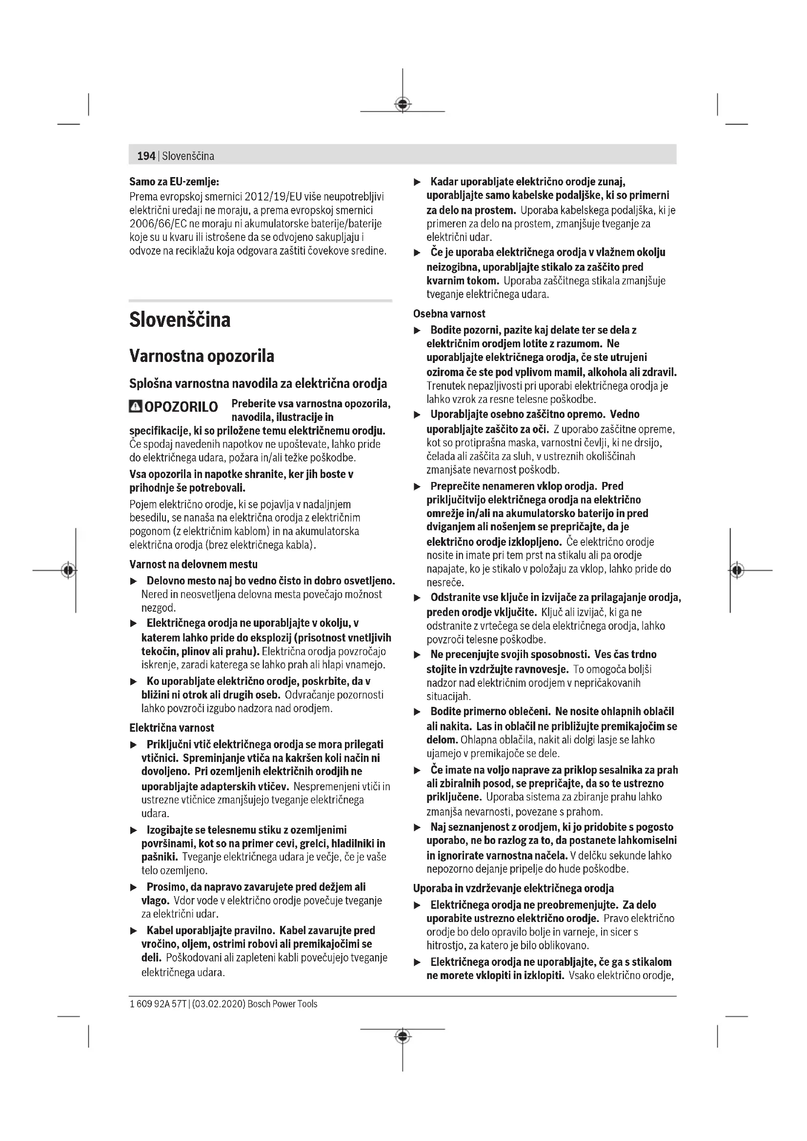 Vrednosti nivoja tresljajev in hrupa, podane v teh navodilih, so bile izmerjene v skladu s standardiziranim merilnim postopkom in se lahko uporabljajo za medsebojno primerjavo električnih orodij. Primerne so tudi za začasno oceno oddajanja tresljajev in hrupa. Naveden nivo tresljajev in hrupa je določen na osnovi glavnih načinov uporabe električnega orodja. Pri uporabi orodja v drugačne namene, z drugačnimi nastavki ali pri nezadostnem vzdrževanju lahko nivo hrupa in tresljajev odstopa. To lahko obremenjenost s hrupom in tresljaji v celotnem obdobju uporabe občutno poveča. Za natančnejšo oceno obremenjenosti s hrupom in tresljaji morate upoštevati tudi čas, ko je orodje izklopljeno, in čas, ko orodje deluje, vendar dejansko ni v uporabi. To lahko občutno zmanjša obremenjenost s hrupom in tresljaji, ki je razporejena na celotno obdobje uporabe. Določite dodatne varnostne ukrepe za zaščito uporabnika pred vplivi tresljajev, npr. vzdrževanje električnega orodja in nastavkov, segrevanje rok, organizacija delovnih postopkov. Namestitev u Pred začetkom kakršnih koli del na električnem orodju izvlecite omrežni vtič iz vtičnice. Namestitev rezkarja (glejteslikoA) u Za namestitev in menjavo rezkarjev priporočamo uporabo zaščitnih rokavic. Za različne vrste uporabe so na voljo rezkarji različnih izvedb in kakovosti. Rezkarji iz visokozmogljivega hitroreznega jekla (HSS) so primerni za obdelovanje mehkih materialov, kot sta na primer mehek les in plastika. Rezkarji z rezili iz karbidne trdine (HM) so primerni predvsem za trde in abrazivne obdelovance, kot sta na primer trd les in aluminij. Originalne rezkarje iz Boschevega obsežnega programa pribora lahko kupite pri svojem specializiranem trgovcu. Nameščajte samo brezhibne in čiste rezkarje. – Premaknite ročico za blokado vretena(6) v levo do prislona (➊). Po potrebi vreteno motorja ročno zavrtite, dokler se ne bo slišno zaskočilo. – Krovno matico(4) z viličastim ključem(31) (dimenzije 19mm) odvijte tako, da jo zavrtite v desno (➋). – Potisnite rezkar v vpenjalno pušo. Steblo rezkarja mora biti vstavljeno v vpenjalno pušo do oznake. – Krovno matico(4) z viličastim ključem(31) (dimenzije19mm) privijte tako, da jo zavrtite v levo. Popolnoma poklopite ročico za blokado vretena(6). u Brez nameščenega kopirnega tulca ne vstavljajte rezkarjev s premerom, večjim od50mm. Ti rezkarji so preveliki za osnovno ploščo. u Dokler rezkar ni nameščen, vpenjalnih klešč ne privijajte s krovno matico. V nasprotnem primeru lahko pride do poškodbe vpenjalnih klešč. Odsesavanje prahu/odrezkov Prah nekaterih materialov, npr. svinčenega premaza, nekaterih vrst lesa, mineralov in kovin je lahko zdravju škodljiv. Stik s kožo ali vdihavanje takšnega prahu lahko povzroči alergijske reakcije in/ali obolenja dihal uporabnika ali oseb v bližini. Določene vrste prahu kot npr. prah hrastovine ali bukovja veljajo za kancerogene, še posebej v kombinaciji z drugimi snovmi, ki so prisotne pri obdelavi lesa (kromat, zaščitno sredstvo za les). Materiale z vsebnostjo azbesta smejo obdelovati le strokovnjaki. – Če je mogoče, uporabljajte sesalnik, ki je primeren glede na vrsto materiala. – Poskrbite za dobro zračenje delovnega mesta. – Priporočamo, da nosite zaščitno masko za prah s filtrirnim razredom P2. Upoštevajte veljavne nacionalne predpise za obdelovalne materiale. u Preprečite nabiranje prahu na delovnem mestu. Prah se lahko hitro vname. Bosch Power Tools 1 609 92A 57T | (03.02.2020)198 | Slovenščina Priklop sistema za odsesavanje (glejteslikoB) Odsesovalno cev (s premerom 35 mm)(32) (pribor) namestite na nameščeni nastavek za odsesavanje. Odsesovalno cev(32) priključite na sesalnik za prah (pribor). Električno orodje lahko priključite neposredno v vtičnico večnamenskega sesalnika Bosch z zagonom na daljavo. Sesalnik se vključi samodejno, hkrati z vklopom električnega orodja. Sesalnik za prah mora biti primeren za obdelovani material. Za odsesavanje zdravju izredno nevarnih, rakotvornih ali suhih vrst prahu uporabljajte poseben sesalnik za prah. Delovanje u Upoštevajte omrežno napetost! Napetost vira električne energije se mora ujemati s podatki na označevalni tablici električnega orodja. Orodje, ki je označeno z 230V, lahko priključite tudi na napetost 220V. Uporaba GOF 1250 LCE: Po priključitvi na električno napajanje trajno sveti svetlobni obroč(3) za osvetlitev površine obdelovanca. Vstavite baterijo (glejte „Menjava baterije (GOF1250LCE) (glejteslikoM)“, Stran200). Pri nekaterih različicah orodja je baterija že vstavljena. Odstranite pečat na bateriji, da jo aktivirate. S tipko(17) nastavite želeno mersko enoto. Izbira števila vrtljajev S kolescem za izbiro števila vrtljajev(28) lahko potrebno število vrtljajev izberete tudi med delovanjem. 1−2 Nizko število vrtljajev 3−4 Srednje število vrtljajev 5−6 Visoko število vrtljajev Vrednosti, navedene v tabeli, so okvirne. Potrebno število vrtljajev je odvisno od obdelovanca in delovnih pogojev. Določite ga lahko s praktičnim preizkusom. Material Premer rezkarja [mm] Položaj kolesca za izbiro števila vrtljajev Trd les (bukev) 4–10 12–20 22–40 5–6 3–4 1–2 Mehak les (bor) 4–10 12–20 22–40 5–6 3–6 1–3 Iverne plošče 4–10 12–20 22–40 3–6 2–4 1–3 Plastika 4–15 16–40 2–3 1–2 Aluminij 4–15 16–40 1–2