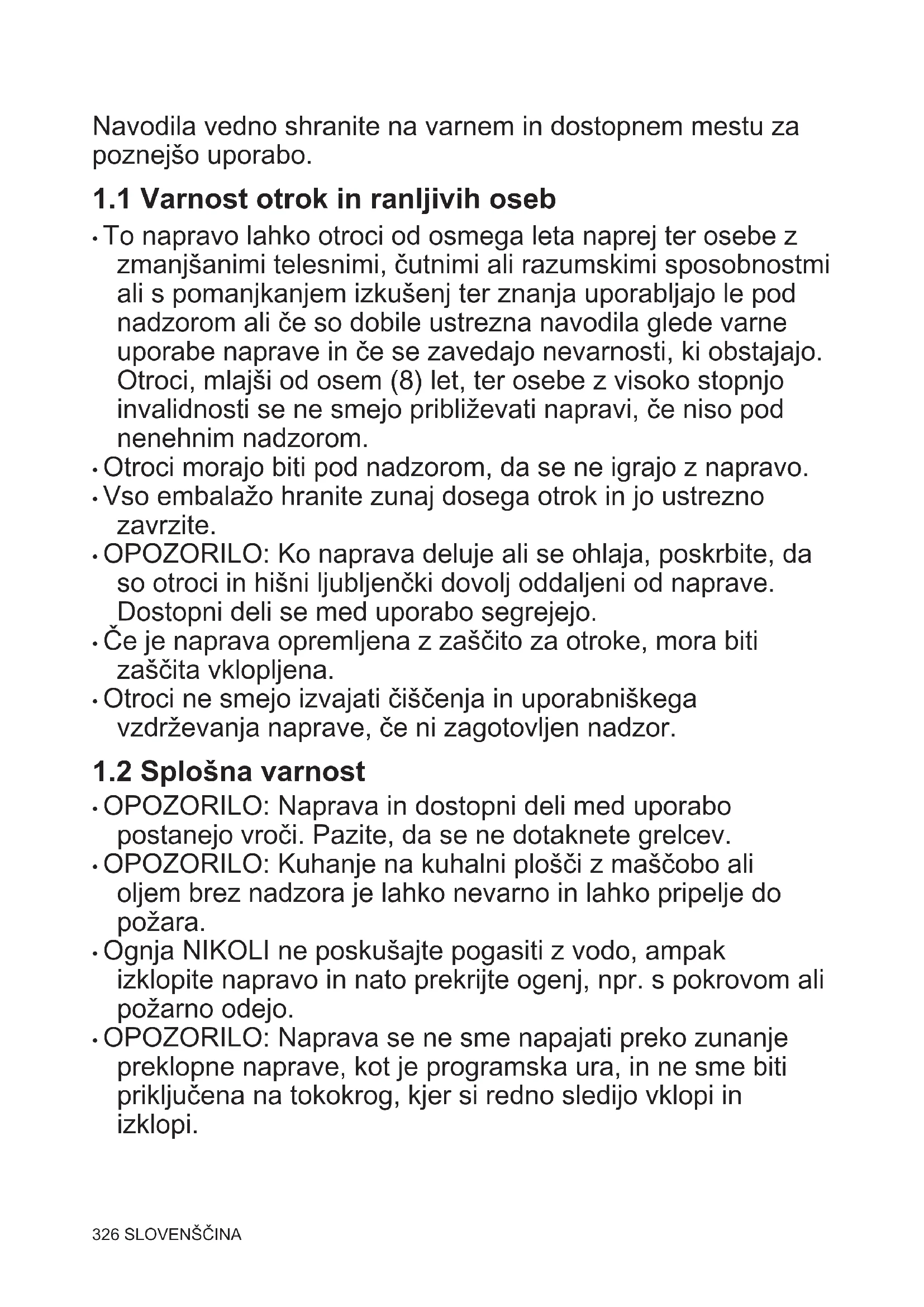 - To napravo lahko otroci od osmega leta naprej ter osebe z zmanjšanimi telesnimi, čutnimi ali razumskimi sposobnostmi ali s pomanjkanjem izkušenj ter znanja uporabljajo le pod nadzorom ali če so dobile ustrezna navodila glede varne uporabe naprave in če se zavedajo nevarnosti, ki obstajajo. Otroci, mlajši od osem (8) let, ter osebe z visoko stopnjo invalidnosti se ne smejo približevati napravi, če niso pod nenehnim nadzorom.