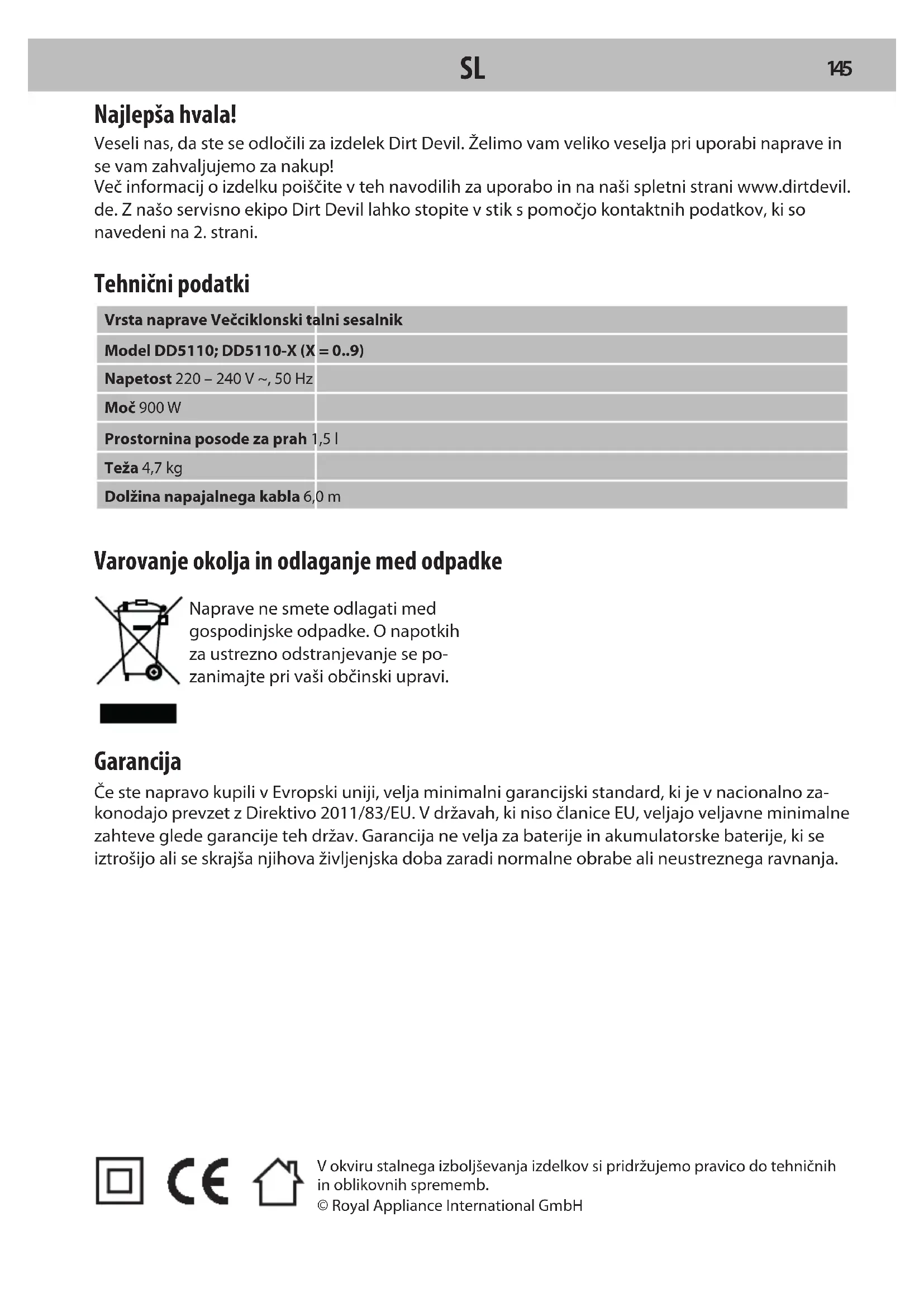 ETV okviru stalnega izboljševanja izdelkov si pridržujemo pravico do tehničnih in oblikovnih sprememb. © Royal Appliance International GmbH Najlepša hvala! Veseli nas, da ste se odločili za izdelek Dirt Devil. Želimo vam veliko veselja pri uporabi naprave in se vam zahvaljujemo za nakup! Več informacij o izdelku poiščite v teh navodilih za uporabo in na naši spletni strani www.dirtdevil. de. Z našo servisno ekipo Dirt Devil lahko stopite v stik s pomočjo kontaktnih podatkov, ki so navedeni na 2. strani. Tehnični podatki Vrsta naprave Večciklonski talni sesalnik Model DD5110; DD5110-X (X = 0..9) Napetost 220 – 240 V ~, 50 Hz Moč 900 W Prostornina posode za prah 1,5 l Teža 4,7 kg Dolžina napajalnega kabla 6,0 m Varovanje okolja in odlaganje med odpadke Naprave ne smete odlagati med gospodinjske odpadke. O napotkih za ustrezno odstranjevanje se po- zanimajte pri vaši občinski upravi. Garancija Če ste napravo kupili v Evropski uniji, velja minimalni garancijski standard, ki je v nacionalno za- konodajo prevzet z Direktivo 2011/83/EU. V državah, ki niso članice EU, veljajo veljavne minimalne zahteve glede garancije teh držav. Garancija ne velja za baterije in akumulatorske baterije, ki se iztrošijo ali se skrajša njihova življenjska doba zaradi normalne obrabe ali neustreznega ravnanja.