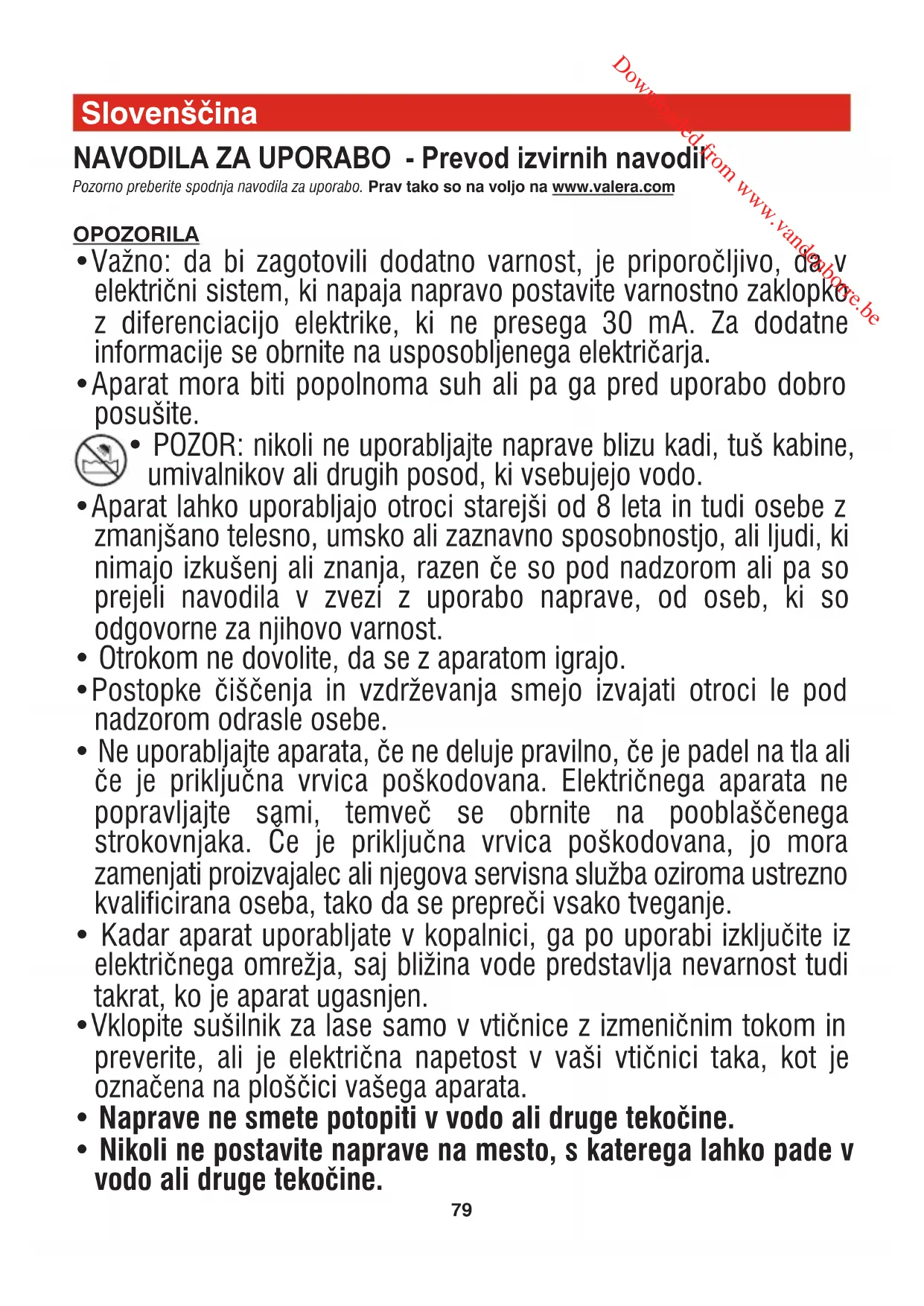 Prevod: PRENOSNI SUŠILEC ZA LASE ZA PROFESIONALNO RABO Downloaded from www.vandenborre.be81 Sušilec mora biti zaščiten pred prahom. Če je potrebno, očistite rešetke za vstop in izstop zraka z mehko ščetko. POZOR: Pri čiščenju sušilnika za lase je prepovedano uporabljati detergente, topila, alkohol in kemične izdelke. Garancija Valera izdaja garancijo za napravo, ki ste jo kupili pod naslednjimi pogoji:
