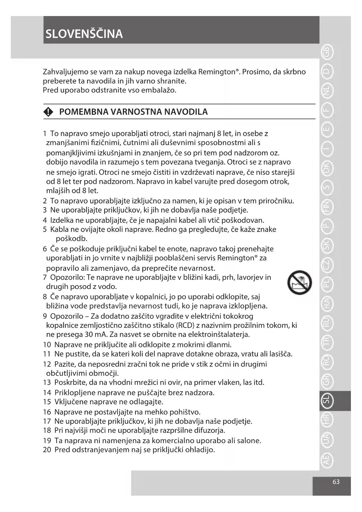 6 Ce se poskoduje priključni kabel te enote, napravo takoj prenehajte uporabljati in jo vrnite v najblžji pooblasčeni servis Remington® za popravilo ali zamenjavo, da preprečite nevarnost.