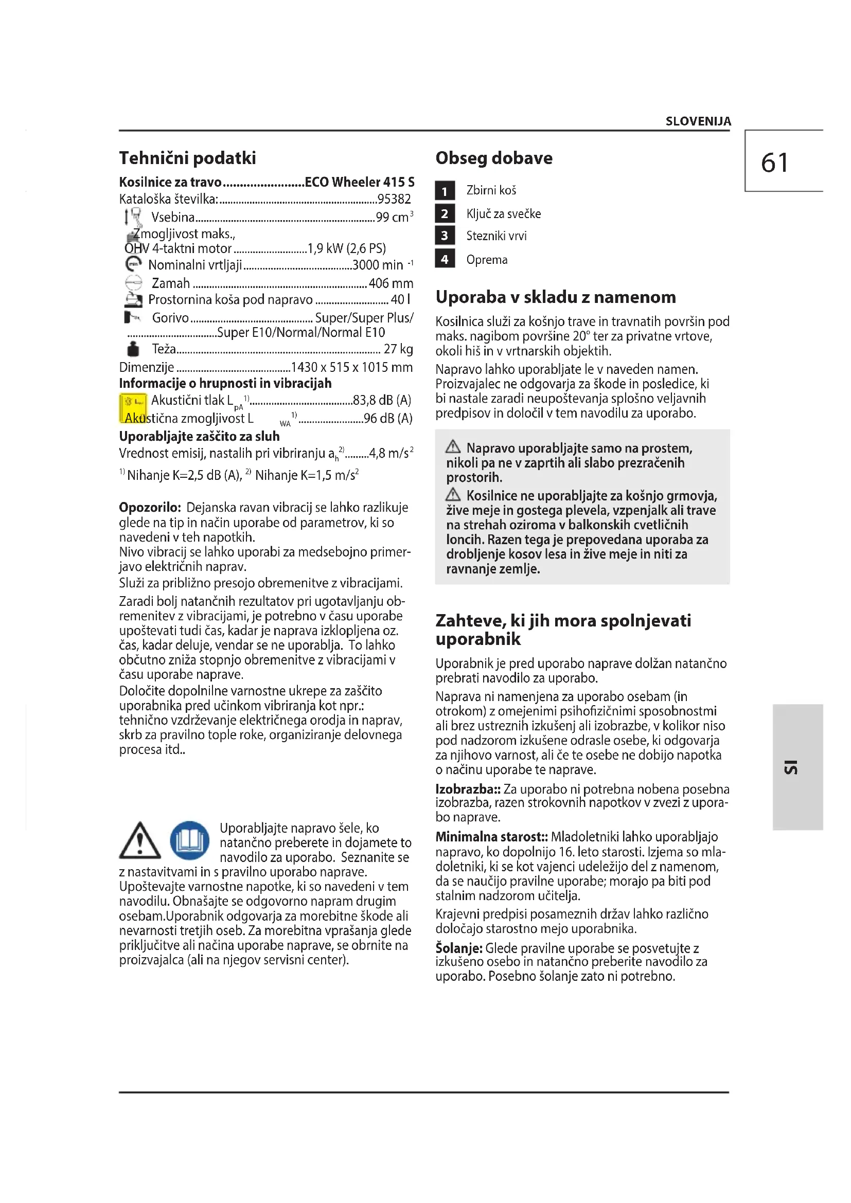 Oprema Uporaba v skladu z namenom Kosilnica služi za košnjo trave in travnatih površin pod maks. nagibom površine 20° ter za privatne vrtove, okoli hiš in v vrtnarskih objektih. Napravo lahko uporabljate le vnaveden namen. Proizvajalec ne odgovarja za škode in posledice, ki bi nastale zaradi neupoštevanja splošno veljavnih predpisov in določil v tem navodilu za uporabo. Napravo uporabljajte samo na prostem, nikoli pa ne v zaprtih ali slabo prezračenih prostorih. Kosilnice ne uporabljajte za košnjo grmovja, žive meje in gostega plevela, vzpenjalk ali trave na strehah oziroma v balkonskih cvetličnih loncih. Razen tega je prepovedana uporaba za drobljenje kosov lesa in žive meje in niti za ravnanje zemlje. Zahteve, ki jih mora spolnjevati uporabnik Uporabnik je pred uporabo naprave dolžan natančno prebrati navodilo za uporabo. Naprava ni namenjena za uporabo osebam (in otrokom) z omejenimi psihozičnimi sposobnostmi ali brez ustreznih izkušenj ali izobrazbe, v kolikor niso pod nadzorom izkušene odrasle osebe, ki odgovarja za njihovo varnost, ali če te osebe ne dobijo napotka o načinu uporabe te naprave. Izobrazba:: Za uporabo ni potrebna nobena posebna izobrazba, razen strokovnih napotkov v zvezi z upora