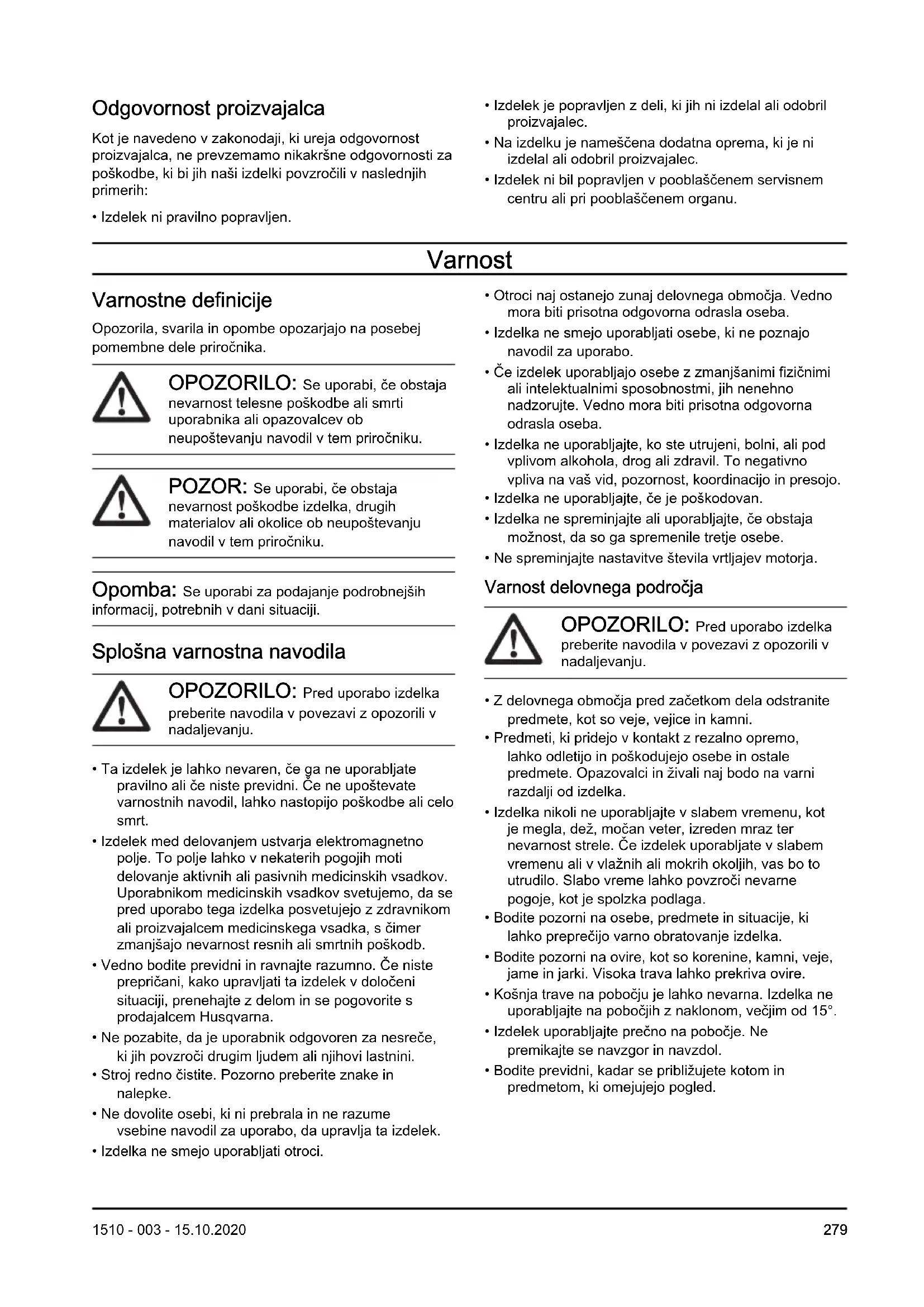 - Bodite previdni, kadar se približujete kotom in predmetom, ki omejujejo pogled. 1510 - 003 - 15.10.2020 279Varnost pri delu OPOZORILO: Pred uporabo izdelka preberite navodila v povezavi z opozorili v nadaljevanju.