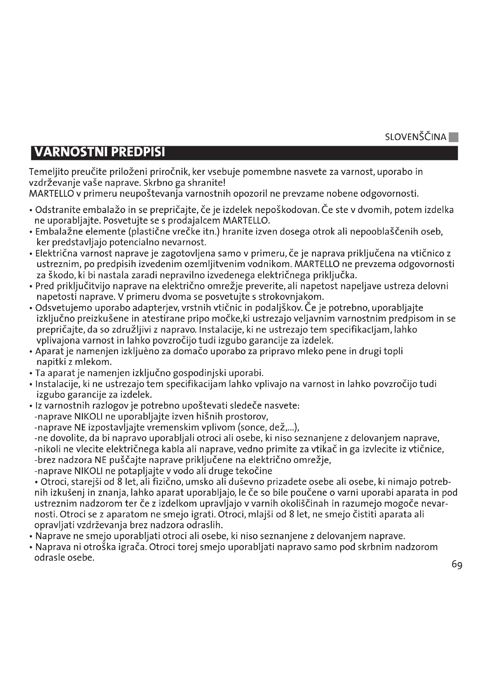 - Naprave ne smete NIKOLI vklopiti prazne (brez vsebine). TEHNIČNI PODATKI: Model „My Milky“ 423008, 220-240V, 50Hz, 600W, izdelano v LR Kitajska MARTELLO si pri izboljšavah izdelkov pridružuje pravico do spremembe videza in/ali tehničnih lastnosti naprave brez predhodnega obvestila. MARTELLO je blagovna znamka družbe Superespresso AG. Copyright © 2012. Vse pravice so pridržane.
