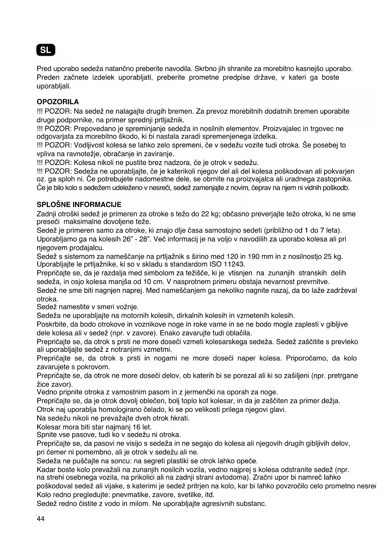 Zadnji otroški sedež je primeren za otroke s težo do 22 kg; občasno preverjajte težo otroka, ki ne sme preseči maksimalne dovoljene teže. Sedež je primeren samo za otroke, ki znajo dlje časa samostojno sedeti (približno od 1 do 7 leta). Uporabljamo ga na kolesih 26” - 28”. Več informacij je na voljo v navodilih za uporabo kolesa ali pri njegovem prodajalcu. Sedež s sistemom za nameščanje na prtljažnik s širino med 120 in 190 mm in z nosilnostjo 25 kg. Uporabljajte le prtljažnike, ki so v skladu s standardom ISO 11243. Prepričajte se, da je razdalja med simbolom za težišče, ki je vtisnjen na zunanjih stranskih delih sedeža, in osjo kolesa manjša od 10 cm. V nasprotnem primeru obstaja nevarnost prevrnitve. Sedež ne sme biti nagnjen naprej. Med nameščanjem ga nekoliko nagnite nazaj, da bo laže zadrževal otroka. Sedež namestite v smeri vožnje. Sedeža ne uporabljajte na motornih kolesih, dirkalnih kolesih in vzmetenih kolesih. Poskrbite, da bodo otrokove in voznikove noge in roke varne in se ne bodo mogle zaplesti v gibljive dele kolesa ali v sedež (npr. v zavore). Enako zavarujte tudi oblačila. Prepričajte se, da otrok s prsti ne more doseči vzmeti kolesarskega sedeža. Sedež zaščitite s prevleko ali uporabljajte sedež z notranjimi vzmetmi. Prepričajte se, da otrok s prsti in nogami ne more doseči naper kolesa. Priporočamo, da kolo zavarujete s pokrovom. Prepričajte se, da otrok ne more doseči delov, ob katerih bi se porezal ali ki so zašiljeni (npr. pretrgane žice zavor). Vedno pripnite otroka z varnostnim pasom in z jermenčki na oporah za noge. Prepričajte se, da je otrok dovolj oblečen, bolj toplo kot kolesar, in da je zaščiten za primer dežja. Otrok naj uporablja homologirano čelado, ki se po velikosti prilega njegovi glavi. Na sedežu nikoli ne prevažajte dveh otrok hkrati. Kolesar mora biti star najmanj 16 let. Spnite vse pasove, tudi ko v sedežu ni otroka. Prepričajte se, da pasovi ne visijo s sedeža in ne segajo do kolesa ali njegovih drugih gibljivih delov, pri čemer ni pomembno, ali je otrok v sedežu ali ne. Sedeža ne puščajte na soncu: na segreti plastiki se otrok lahko opeče. Kadar boste kolo prevažali na zunanjih nosilcih vozila, vedno najprej s kolesa odstranite sedež (npr. na strehi osebnega vozila, na prikolici ali na zadnji strani avtodoma). Zračni upor bi namreč lahko poškodoval sedež ali vijake, s katerimi je sedež pritrjen na kolo, kar bi lahko povzročilo celo prometno nesrečo. Kolo redno pregledujte: pnevmatike, zavore, svetilke, itd. Sedež redno čistite z vodo in milom. Ne uporabljajte agresivnih substanc. SL45