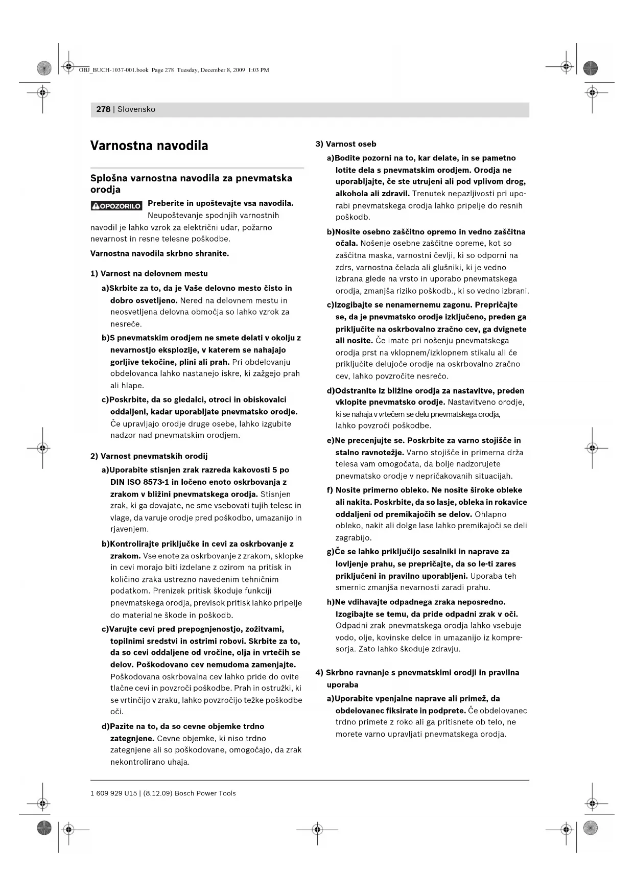 uporaba a)Uporabite vpenjalne naprave ali primež, da obdelovanec fiksirate in podprete. Če obdelovanec trdno primete z roko ali ga pritisnete ob telo, ne morete varno upravljati pnevmatskega orodja. OPOZORILO OBJ_BUCH-1037-001.book Page 278 Tuesday, December 8, 2009 1:03 PMSlovensko | 279 Bosch Power Tools 1 609 929 U15 | (8.12.09) b)Pnevmatskega orodja ne smete preobremenjevati. Za Vaše delo uporabite pnevmatsko orodje, ki je za ta določeno. Z ustreznim orodjem delate bolje in varneje v območju zmogljivosti, ki je zanj navedeno. c)Ne uporabljajte pnevmatskega orodja, ki ima defektno vklopno/izklopno stikalo. Pnevmatsko orodje, ki se ne da vklopiti ali izklopiti, je nevarno in ga morate dati v popravilo. d)Prekinite oskrbovanje z zrakom, preden se lotite nastavitev aparata ali menjave rezervnih delov in preden odložite pnevmatsko orodje. Ta varnostni ukrep onemogoči nenameren zagon pnevmatskega orodja. e)Neuporabljena pnevmatska orodja hranite na mestu izven dosega otrok. Ne dovolite, da uporabljajo pnevmatsko orodje osebe, ki niso s tem seznanjene ali niso prebrale teh navodil. Pnevmatska orodja so nevarna, če jih uporabljajo osebe, ki so neizkušene. f) Pnevmatsko orodje skrbno negujte. Kontrolirajte, ali gibljivi deli aparata brezhibno delujejo in se ne zatikajo, in ali so deli aparata zlomljeni ali tako poškodovani, da škodujejo delovanju pnev- matskega orodja. Poškodovane dele dajte v po- pravilo pred uporabo pnevmatskega orodja. Vzrok za mnogo nesreč je slabo vzdrževano pnevmatsko orodje. g)Uporabite pnevmatsko orodje, pribor, vsadno orodje itd. ustrezno tem navodilom. Upoštevajte pri tem delovne pogoje in dejavnost, ki jo morate opraviti. Uporaba pnevmatskega orodja za namene, ki niso predvideni, lahko pripelje do nevarnih situacij.