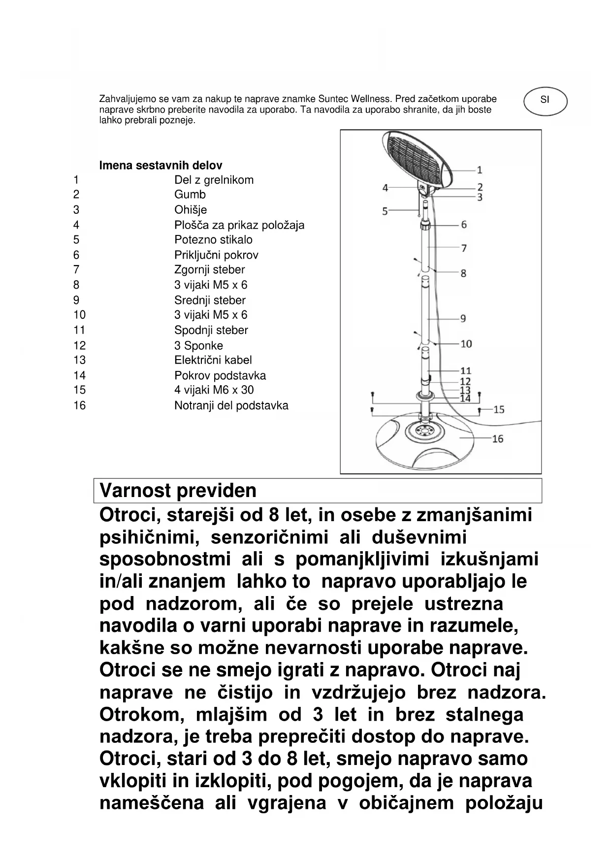 V tem grelniku je vgrajeno stikalo za primer prekucnitve. Če se grelnik za terase prevrne, se izklopi. Ko napravo znova postavite pokonci, se samodejno vključi. NAPETOST Pred prvo uporabo naprave preverite, ali se navedena napetost električnega omrežja ujema z napetostjo vašega električnega omrežja. Napravo priključite na ozemljeno vtičnico. VARNOST Pozor: Pred nameščanjem ali odstranjevanjem naprave poskrbite, da je električni kabel naprave ločen od električnega napajanja.