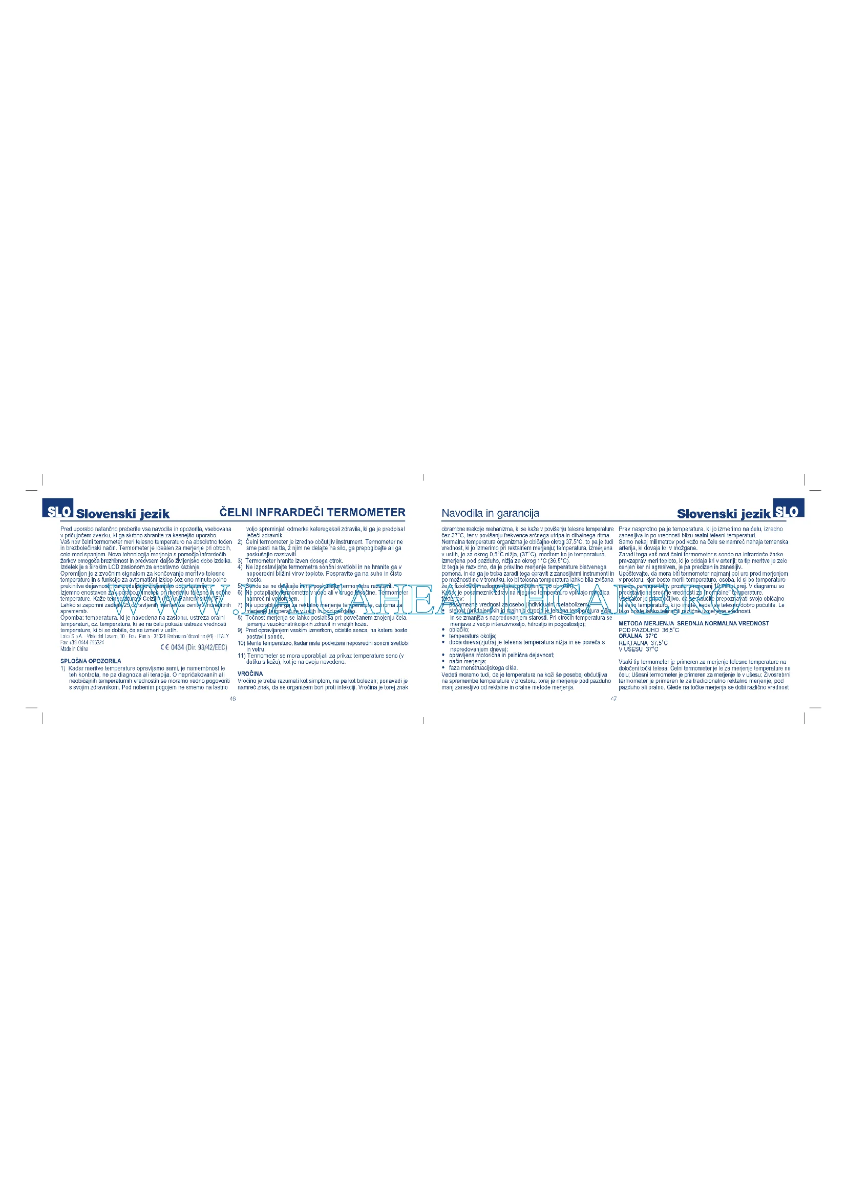 Polski WWW.LAICAHEALTHCARE.ROČELNI INFRARDEČI TERMOMETER Pred uporabo natančno preberite vsa navodila in opozorila, vsebovana v pričujočem zvezku, ki ga skrbno shranite za kasnejšo uporabo. Vaš nov čelni termometer meri telesno temperaturo na absolutno točen in brezbolečinski način. Termometer je idealen za merjenje pri otrocih, celo med spanjem. Nova tehnologija merjenja s pomočjo infrardečih žarkov omogoča brezhibnost in predvsem daljšo življenjsko dobo izdelka. Izdelek je s širokim LCD zaslonom za enostavno kazanje. Opremljen je z zvočnim signalom za končevanje meritve telesne temperature in s funkcijo za avtomatični izklop čez eno minuto polne prekinitve dejavnosti, kar podaljšuje življenjsko dobo baterije. Izjemno enostaven za uporabo,primeren pri merjenju telesne in sobne temperature. Kaže temperaturo v Celzijih (°C) in Fahrenheitih (°F). Lahko si zapomni zadnjih 25 opravljenih meritev za cenitev morebitnih sprememb. Opomba: temperatura, ki je navedena na zaslonu, ustreza oralni temperaturi, oz. temperatura, ki se na čelu pokaže ustreza vrednosti temperature, ki bi se dobila, če se izmeri v ustih. Laica S.p.A. - Viale del Lavoro, 10 - Fraz. Ponte - 36021 Barbarano Vicentino (VI) - ITALY Fax: +39-0444-795324Made in China