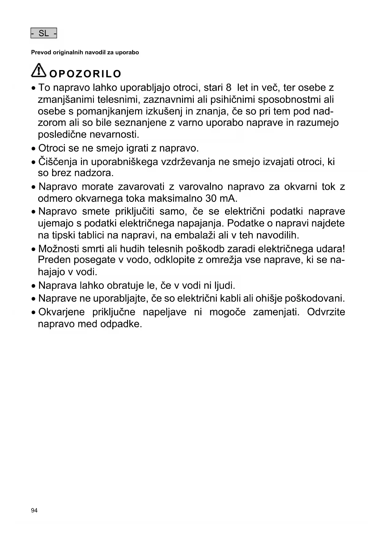 - Možnosti smrti ali hudih telesnih poškodb zaradi električnega udara! Preden posegate v vodo, odklopite z omrežja vse naprave, ki se na- hajajo v vodi.