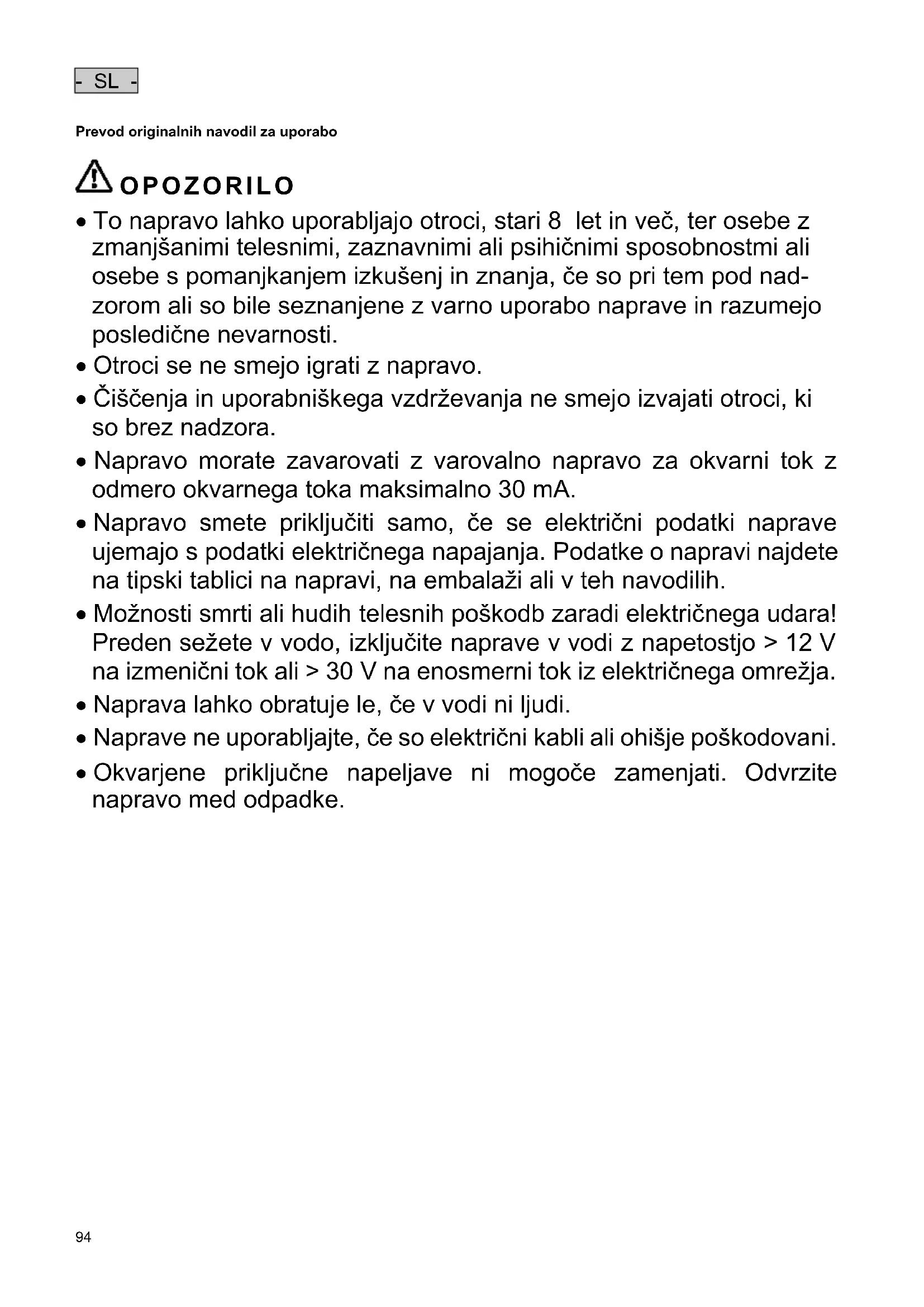 - Električne naprave in instalacije z nazivno napetostjo U > 12 V AC ali U >30 V DC, ki so nameščene v vodi: Naprave in instalacije izključite iz električnega omrežja, preden sežete v vodo.