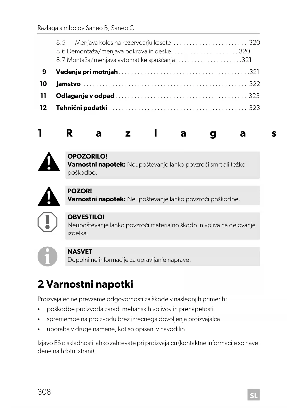 uporaba v druge namene, kot so opisani v navodilih Izjavo ES o skladnosti lahko zahtevate pri proizvajalcu (kontaktne informacije so nave- dene na hrbtni strani). OPOZORILO! Varnostni napotek: Neupoštevanje lahko povzroči smrt ali težko poškodbo. POZOR! Varnostni napotek: Neupoštevanje lahko povzroči poškodbe. OBVESTILO! Neupoštevanje lahko povzroči materialno škodo in vpliva na delovanje izdelka. NASVET Dopolnilne informacije za upravljanje naprave. Saneo-B-Saneo-C--O-18s.book Seite 308 Mittwoch, 7. März 2018 9:33 09SL Saneo B, Saneo C Varnostni napotki
