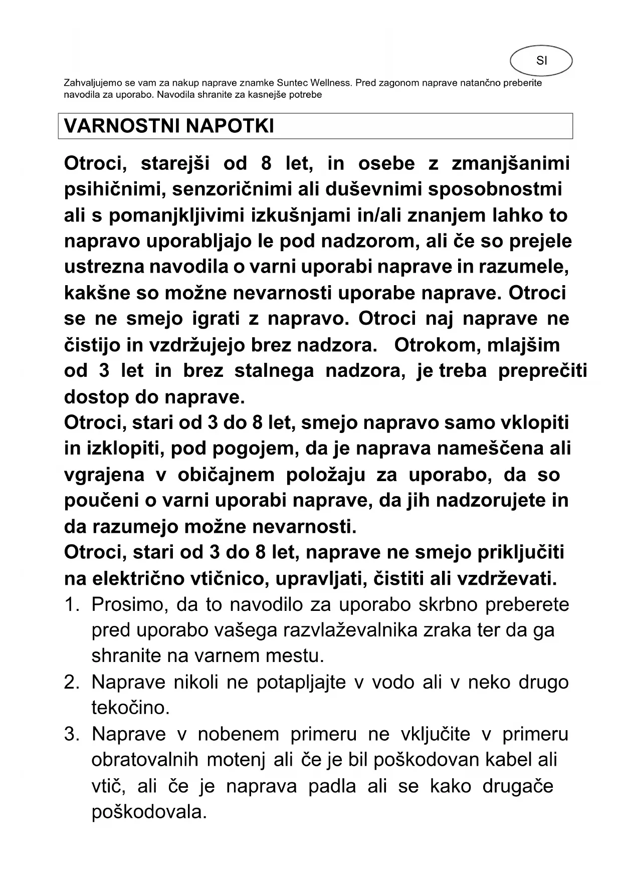 DryFix 20 Lumio SUNTEC WELLNESS GMBH / HOLZSTRASSE 2 / 40221 DÜSSELDORF / DEUTSCHLANDZahvaljujemo se vam za nakup naprave znamke Suntec Wellness. Pred zagonom naprave natančno preberite navodila za uporabo. Navodila shranite za kasnejše potrebe VARNOSTNI NAPOTKI Otroci, starejši od 8 let, in osebe z zmanjšanimi psihičnimi, senzoričnimi ali duševnimi sposobnostmi ali s pomanjkljivimi izkušnjami in/ali znanjem lahko to napravo uporabljajo le pod nadzorom, ali če so prejele ustrezna navodila o varni uporabi naprave in razumele, kakšne so možne nevarnosti uporabe naprave. Otroci se ne smejo igrati z napravo. Otroci naj naprave ne čistijo in vzdržujejo brez nadzora. Otrokom, mlajšim od 3 let in brez stalnega nadzora, je treba preprečiti dostop do naprave. Otroci, stari od 3 do 8 let, smejo napravo samo vklopiti in izklopiti, pod pogojem, da je naprava nameščena ali vgrajena v običajnem položaju za uporabo, da so poučeni o varni uporabi naprave, da jih nadzorujete in da razumejo možne nevarnosti. Otroci, stari od 3 do 8 let, naprave ne smejo priključiti na električno vtičnico, upravljati, čistiti ali vzdrževati.