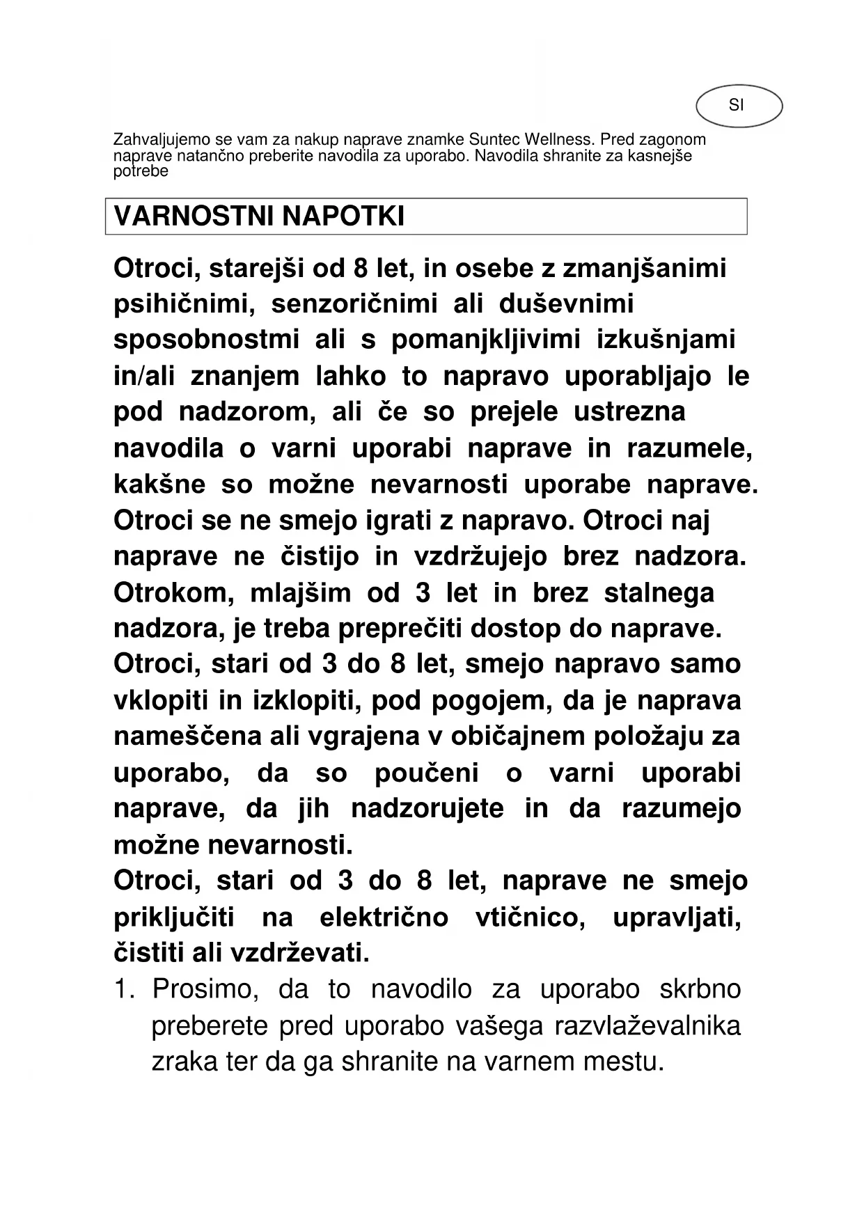DryFix SUNTEC WELLNESS GMBH / HOLZSTRASSE 2 / 40 221 DÜSSELDORF / GERMANYZahvaljujemo se vam za nakup naprave znamke Suntec Wellness. Pred zagonom naprave natančno preberite navodila za uporabo. Navodila shranite za kasnejše potrebe VARNOSTNI NAPOTKI Otroci, starejši od 8 let, in osebe z zmanjšanimi psihičnimi, senzoričnimi ali duševnimi sposobnostmi ali s pomanjkljivimi izkušnjami in/ali znanjem lahko to napravo uporabljajo le pod nadzorom, ali če so prejele ustrezna navodila o varni uporabi naprave in razumele, kakšne so možne nevarnosti uporabe naprave. Otroci se ne smejo igrati z napravo. Otroci naj naprave ne čistijo in vzdržujejo brez nadzora. Otrokom, mlajšim od 3 let in brez stalnega nadzora, je treba preprečiti dostop do naprave. Otroci, stari od 3 do 8 let, smejo napravo samo vklopiti in izklopiti, pod pogojem, da je naprava nameščena ali vgrajena v običajnem položaju za uporabo, da so poučeni o varni uporabi naprave, da jih nadzorujete in da razumejo možne nevarnosti. Otroci, stari od 3 do 8 let, naprave ne smejo priključiti na električno vtičnico, upravljati, čistiti ali vzdrževati.
