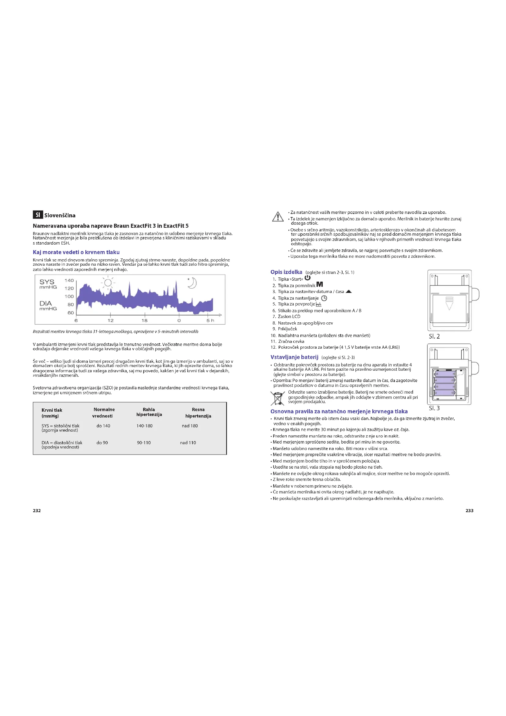 Slovenščina Nameravana uporaba naprave Braun ExactFit 3 in ExactFit 5 Braunov nadlaktni merilnik krvnega tlaka je zasnovan za natančno in udobno merjenje krvnega tlaka. Natančnost merjenja je bila preizkušena ob izdelavi in preverjena s kliničnimi raziskavami v skladu s standardom ESH. Kaj morate vedeti o krvnem tlaku Krvni tlak se med dnevom stalno spreminja. Zgodaj zjutraj strmo naraste, dopoldne pada, popoldne znova naraste in zvečer pade na nizko raven. Vendar pa se lahko krvni tlak tudi zelo hitro spreminja, zato lahko vrednosti zaporednih merjenj nihajo. Rezultati meritev krvnega tlaka 31-letnega moškega, opravljene v 5-minutnih intervalih V ambulanti izmerjeni krvni tlak predstavlja le trenutno vrednost. Večkratne meritve doma bolje odražajo dejanske vrednosti vašega krvnega tlaka v običajnih pogojih. Še več – veliko ljudi si doma izmeri precej drugačen krvni tlak, kot jim ga izmerijo v ambulanti, saj so v domačem okolju bolj sproščeni. Rezultati rednih meritev krvnega tlaka, ki jih opravite doma, so lahko dragocena informacija tudi za vašega zdravnika, saj mu povedo, kakšen je vaš krvni tlak v dejanskih, »vsakdanjih« razmerah. Svetovna zdravstvena organizacija (SZO) je postavila naslednje standardne vrednosti krvnega tlaka, izmerjene pri umirjenem srčnem utripu. Krvni tlak (mmHg) Normalne vrednosti Rahla hipertenzija Resna hipertenzija SYS = sistolični tlak do 140 140-180 nad 180 (zgornja vrednost) DIA = diastolični tlak do 90 90-110 nad 110 (spodnja vrednost)