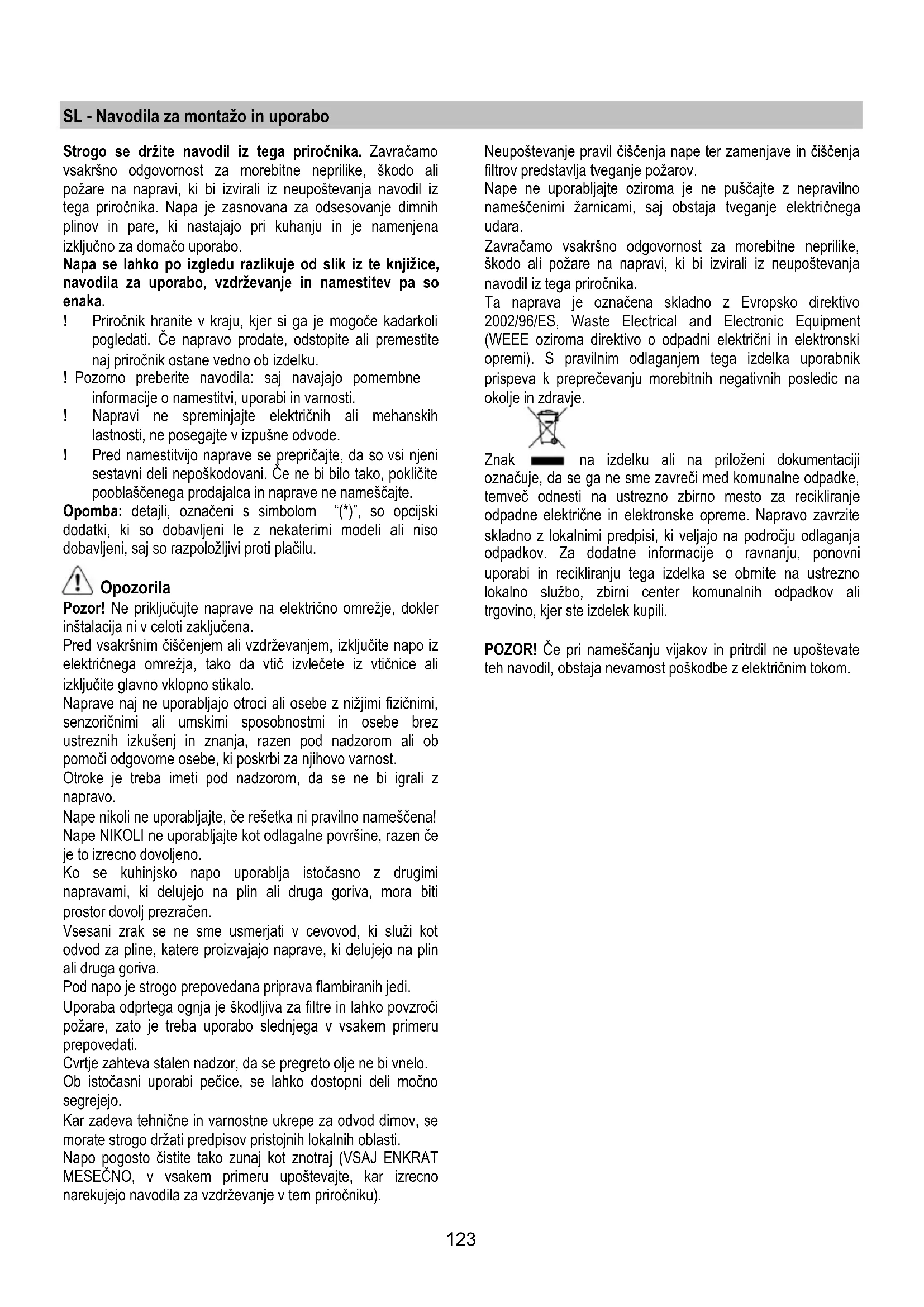 - Aktivni karbonski filter koji se NE može oprati. Filter od aktivnih karbona koji se sme prati Karbonski filter se može oprati svako dva meseca u toploj vodi i uz pomoć prikladnih deterdženata ili u mašini za pranje sudova na 65°C ( u slučaju da ga perete u mašini za pranje sudova obavite kompletan ciklus pranja bez drugih sudova unutra). Eliminišite višak vode bez da oštetite filter a posle toga izvadite madraščić koji se nalazi u plastičnom postolju te ga stavite u peć u trajanju od 10 minuta na temperaturi od 100°C da bi ga kompletno osušili. Zamenite madraščić svako 3 godine ili svaki put kada primetite da je tkanina oštećena. Filter od aktivnih karbona koji se NE sme prati Do zasićenja karbonskog filtera dolazi posle produžene upotrebe i zavisi od vrste kuhinje i od toga koliko često se prao filter za uklanjanje masnoće. U svakom je slučaju potrebno zameniti kartušu svaka 4 meseca. NE može se prati ili obnavljati. Montaža Zakačite aktivni karbonski filter najpre sa stražnje strane na metalni preklopac kuhinjske nape, posle na prednjoj strani pomoću dve okrugle drške. Razmontiranje Uklonite aktivni karbonski filter okrećući 90° okrugle drške koje ga pričvršćuju za kuhinjsku napu. Zamenjivanje Lampe Kuhinjska napa je opremljena sistemom rasvete koja se bazira na LED tehnologiji. LED garantuje optimalnu rasvetu, trajnost za 10 puta veću od tradicionalnih lampi i omogućuju uštedu električne energije za 90% . Što se tiče njihove zamene obratite se tehničkom servisu.123 SL - Navodila za montažo in uporabo Strogo se držite navodil iz tega priročnika. Zavračamo vsakršno odgovornost za morebitne neprilike, škodo ali požare na napravi, ki bi izvirali iz neupoštevanja navodil iz tega priročnika. Napa je zasnovana za odsesovanje dimnih plinov in pare, ki nastajajo pri kuhanju in je namenjena izključno za domačo uporabo. Napa se lahko po izgledu razlikuje od slik iz te knjižice, navodila za uporabo, vzdrževanje in namestitev pa so enaka. ! Priročnik hranite v kraju, kjer si ga je mogoče kadarkoli pogledati. Če napravo prodate, odstopite ali premestite naj priročnik ostane vedno ob izdelku. ! Pozorno preberite navodila: saj navajajo pomembne informacije o namestitvi, uporabi in varnosti. ! Napravi ne spreminjajte električnih ali mehanskih lastnosti, ne posegajte v izpušne odvode. ! Pred namestitvijo naprave se prepričajte, da so vsi njeni sestavni deli nepoškodovani. Če ne bi bilo tako, pokličite pooblaščenega prodajalca in naprave ne nameščajte. Opomba: detajli, označeni s simbolom “(*)”, so opcijski dodatki, ki so dobavljeni le z nekaterimi modeli ali niso dobavljeni, saj so razpoložljivi proti plačilu. Opozorila Pozor! Ne priključujte naprave na električno omrežje, dokler inštalacija ni v celoti zaključena. Pred vsakršnim čiščenjem ali vzdrževanjem, izključite napo iz električnega omrežja, tako da vtič izvlečete iz vtičnice ali izključite glavno vklopno stikalo. Naprave naj ne uporabljajo otroci ali osebe z nižjimi fizičnimi, senzoričnimi ali umskimi sposobnostmi in osebe brez ustreznih izkušenj in znanja, razen pod nadzorom ali ob pomoči odgovorne osebe, ki poskrbi za njihovo varnost. Otroke je treba imeti pod nadzorom, da se ne bi igrali z napravo. Nape nikoli ne uporabljajte, če rešetka ni pravilno nameščena! Nape NIKOLI ne uporabljajte kot odlagalne površine, razen če je to izrecno dovoljeno. Ko se kuhinjsko napo uporablja istočasno z drugimi napravami, ki delujejo na plin ali druga goriva, mora biti prostor dovolj prezračen. Vsesani zrak se ne sme usmerjati v cevovod, ki služi kot odvod za pline, katere proizvajajo naprave, ki delujejo na plin ali druga goriva. Pod napo je strogo prepovedana priprava flambiranih jedi. Uporaba odprtega ognja je škodljiva za filtre in lahko povzroči požare, zato je treba uporabo slednjega v vsakem primeru prepovedati. Cvrtje zahteva stalen nadzor, da se pregreto olje ne bi vnelo. Ob istočasni uporabi pečice, se lahko dostopni deli močno segrejejo. Kar zadeva tehnične in varnostne ukrepe za odvod dimov, se morate strogo držati predpisov pristojnih lokalnih oblasti. Napo pogosto čistite tako zunaj kot znotraj (VSAJ ENKRAT MESEČNO, v vsakem primeru upoštevajte, kar izrecno narekujejo navodila za vzdrževanje v tem priročniku). Neupoštevanje pravil čiščenja nape ter zamenjave in čiščenja filtrov predstavlja tveganje požarov. Nape ne uporabljajte oziroma je ne puščajte z nepravilno nameščenimi žarnicami, saj obstaja tveganje elektri čnega udara. Zavračamo vsakršno odgovornost za morebitne neprilike, škodo ali požare na napravi, ki bi izvirali iz neupoštevanja navodil iz tega priročnika. Ta naprava je označena skladno z Evropsko direktivo 2002/96/ES, Waste Electrical and Electronic Equipment (WEEE oziroma direktivo o odpadni električni in elektronski opremi). S pravilnim odlaganjem tega izdelka uporabnik prispeva k preprečevanju morebitnih negativnih posledic na okolje in zdravje. Znak na izdelku ali na priloženi dokumentaciji označuje, da se ga ne sme zavreči med komunalne odpadke, temveč odnesti na ustrezno zbirno mesto za recikliranje odpadne električne in elektronske opreme. Napravo zavrzite skladno z lokalnimi predpisi, ki veljajo na področju odlaganja odpadkov. Za dodatne informacije o ravnanju, ponovni uporabi in recikliranju tega izdelka se obrnite na ustrezno lokalno službo, zbirni center komunalnih odpadkov ali trgovino, kjer ste izdelek kupili. POZOR! Če pri nameščanju vijakov in pritrdil ne upoštevate teh navodil, obstaja nevarnost poškodbe z električnim tokom.124 Uporaba Napa je izdelana za uporabo v odzračevalni različici z zunanjim odvodom ali obtočni oz. filtracijski z notranjim obtokom. Odzračevalna različica Hlapi so usmerjeni navzven po odvodni cevi, ki je pritrjena na priključno prirobnico. Premer odvodne cevi mora biti enak premeru spojnega obročka. Pozor! Odvodna cev ni pril