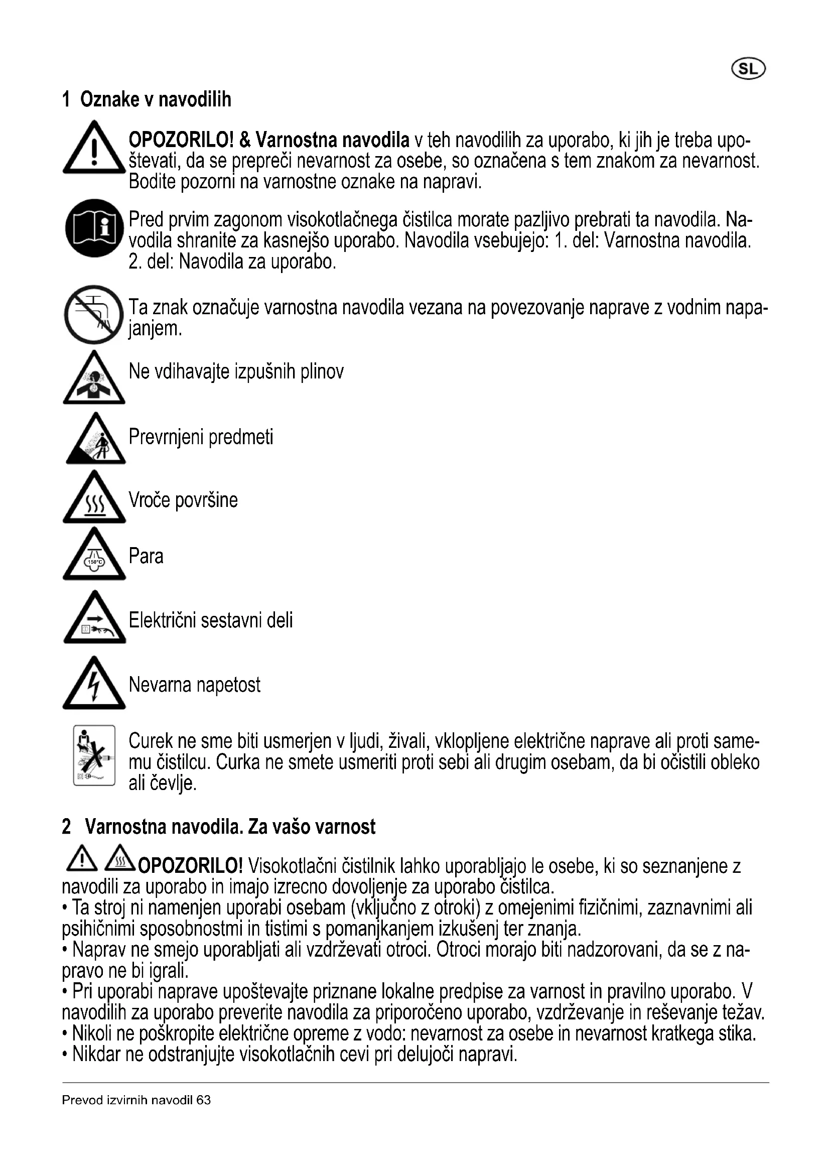 Ta znak označuje varnostna navodila vezana na povezovanje naprave z vodnim napa- janjem. Ne vdihavajte izpušnih plinov Prevrnjeni predmeti Vroče površine Para Električni sestavni deli Nevarna napetost Curek ne sme biti usmerjen v ljudi, živali, vklopljene električne naprave ali proti same- mu čistilcu. Curka ne smete usmeriti proti sebi ali drugim osebam, da bi očistili obleko ali čevlje. 2 Varnostna navodila. Za vašo varnost OPOZORILO! Visokotlačni čistilnik lahko uporabljajo le osebe, ki so seznanjene z navodili za uporabo in imajo izrecno dovoljenje za uporabo čistilca.