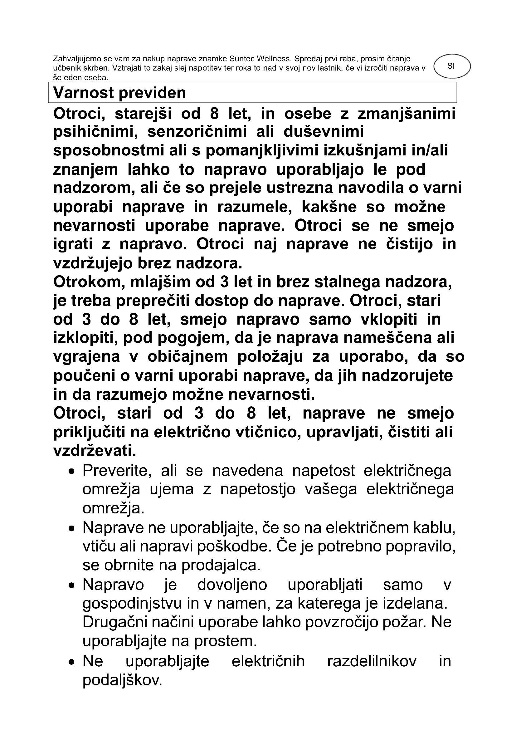 CoolBreeze SUNTEC WELLNESS GMBH / HOLZSTRASSE 2 / 40 221 DÜSSELDORF / GERMANYZahvaljujemo se vam za nakup naprave znamke Suntec Wellness. Spredaj prvi raba, prosim čitanje učbenik skrben. Vztrajati to zakaj slej napotitev ter roka to nad v svoj nov lastnik, če vi izročiti naprava v še eden oseba. Varnost previden Otroci, starejši od 8 let, in osebe z zmanjšanimi psihičnimi, senzoričnimi ali duševnimi sposobnostmi ali s pomanjkljivimi izkušnjami in/ali znanjem lahko to napravo uporabljajo le pod nadzorom, ali če so prejele ustrezna navodila o varni uporabi naprave in razumele, kakšne so možne nevarnosti uporabe naprave. Otroci se ne smejo igrati z napravo. Otroci naj naprave ne čistijo in vzdržujejo brez nadzora. Otrokom, mlajšim od 3 let in brez stalnega nadzora, je treba preprečiti dostop do naprave. Otroci, stari od 3 do 8 let, smejo napravo samo vklopiti in izklopiti, pod pogojem, da je naprava nameščena ali vgrajena v običajnem položaju za uporabo, da so poučeni o varni uporabi naprave, da jih nadzorujete in da razumejo možne nevarnosti. Otroci, stari od 3 do 8 let, naprave ne smejo priključiti na električno vtičnico, upravljati, čistiti ali vzdrževati.