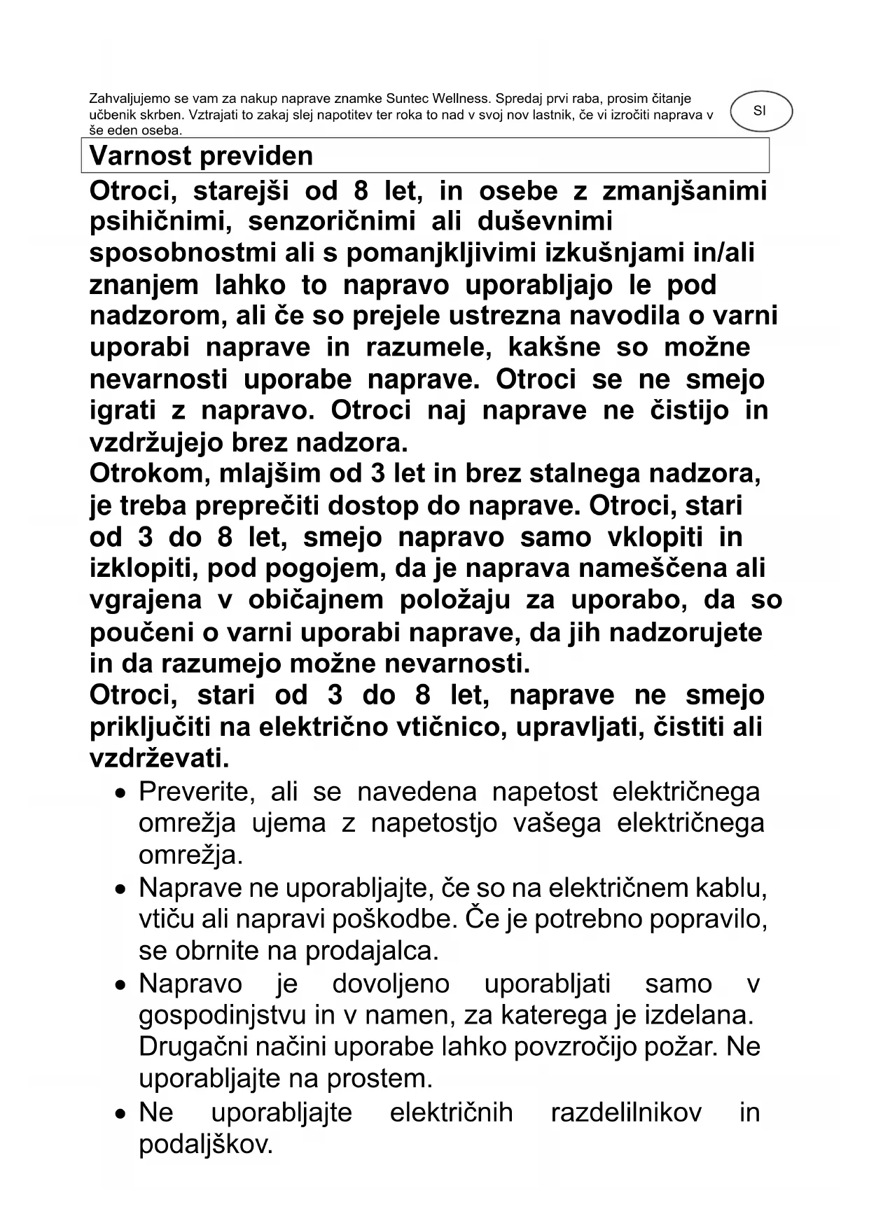 CoolBreeze SUNTEC WELLNESS GMBH / HOLZSTRASSE 2 / 40 221 DÜSSELDORF / GERMANYZahvaljujemo se vam za nakup naprave znamke Suntec Wellness. Spredaj prvi raba, prosim čitanje učbenik skrben. Vztrajati to zakaj slej napotitev ter roka to nad v svoj nov lastnik, če vi izročiti naprava v še eden oseba. Varnost previden Otroci, starejši od 8 let, in osebe z zmanjšanimi psihičnimi, senzoričnimi ali duševnimi sposobnostmi ali s pomanjkljivimi izkušnjami in/ali znanjem lahko to napravo uporabljajo le pod nadzorom, ali če so prejele ustrezna navodila o varni uporabi naprave in razumele, kakšne so možne nevarnosti uporabe naprave. Otroci se ne smejo igrati z napravo. Otroci naj naprave ne čistijo in vzdržujejo brez nadzora. Otrokom, mlajšim od 3 let in brez stalnega nadzora, je treba preprečiti dostop do naprave. Otroci, stari od 3 do 8 let, smejo napravo samo vklopiti in izklopiti, pod pogojem, da je naprava nameščena ali vgrajena v običajnem položaju za uporabo, da so poučeni o varni uporabi naprave, da jih nadzorujete in da razumejo možne nevarnosti. Otroci, stari od 3 do 8 let, naprave ne smejo priključiti na električno vtičnico, upravljati, čistiti ali vzdrževati.