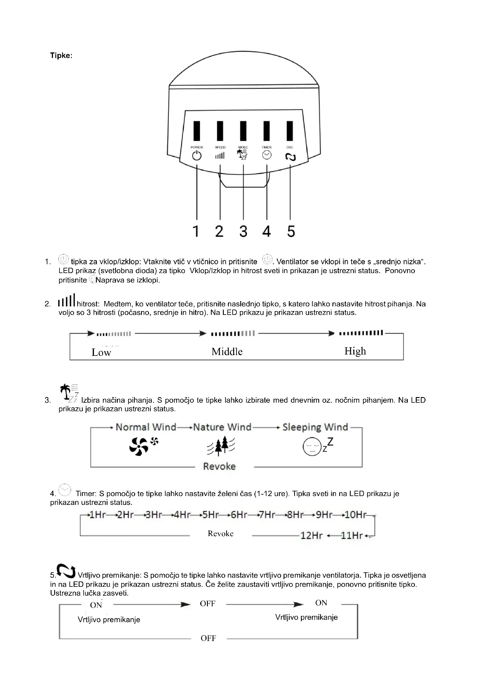 5. Vrtljivo premikanje: S pomočjo te tipke lahko nastavite vrtljivo premikanje ventilatorja. Tipka je osvetljena
