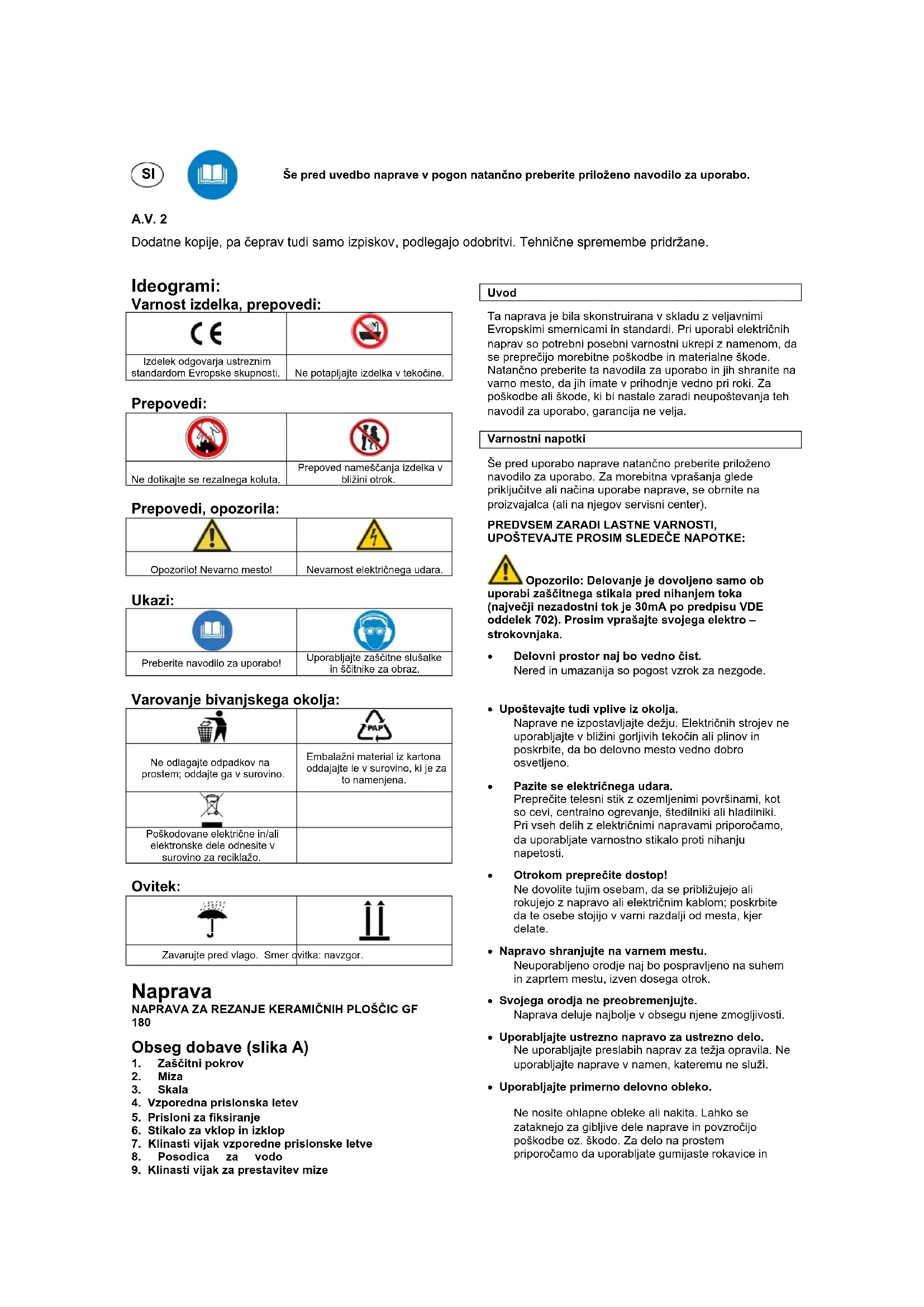 Obseg dobave (slika A) 1. Zaščitni pokrov 2. Miza 3. Skala 4. Vzporedna prislonska letev 5. Prisloni za fiksiranje 6. Stikalo za vklop in izklop 7. Klinasti vijak vzporedne prislonske letve 8. Posodica za vodo 9. Klinasti vijak za prestavitev mize Uvod Ta naprava je bila skonstruirana v skladu z veljavnimi Evropskimi smernicami in standardi. Pri uporabi električnih naprav so potrebni posebni varnostni ukrepi z namenom, da se preprečijo morebitne poškodbe in materialne škode. Natančno preberite ta navodila za uporabo in jih shranite na varno mesto, da jih imate v prihodnje vedno pri roki. Za poškodbe ali škode, ki bi nastale zaradi neupoštevanja teh navodil za uporabo, garancija ne velja.