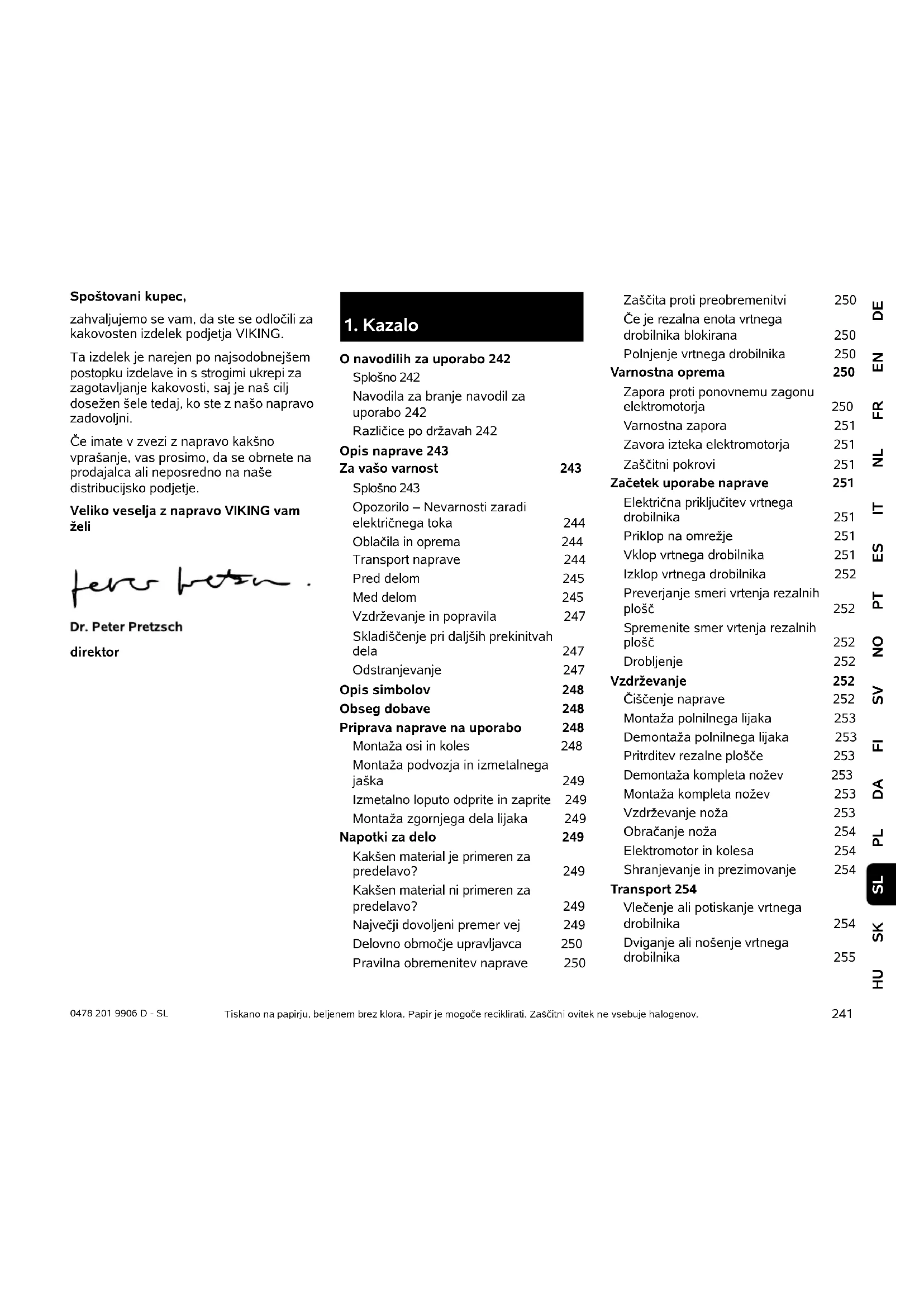 DEENFRNLITESPTNOSVFIDAPLSKHU SL 0478 201 9906 D - SL Spoštovani kupec, zahvaljujemo se vam, da ste se odločili za kakovosten izdelek podjetja VIKING. Ta izdelek je narejen po najsodobnejšem postopku izdelave in s strogimi ukrepi za zagotavljanje kakovosti, saj je naš cilj dosežen šele tedaj, ko ste z našo napravo zadovoljni. Če imate v zvezi z napravo kakšno vprašanje, vas prosimo, da se obrnete na prodajalca ali neposredno na naše distribucijsko podjetje. Veliko veselja z napravo VIKING vam želi direktor Tiskano na papirju, beljenem brez klora. Papir je mogoče reciklirati. Zaščitni ovitek ne vsebuje halogenov.