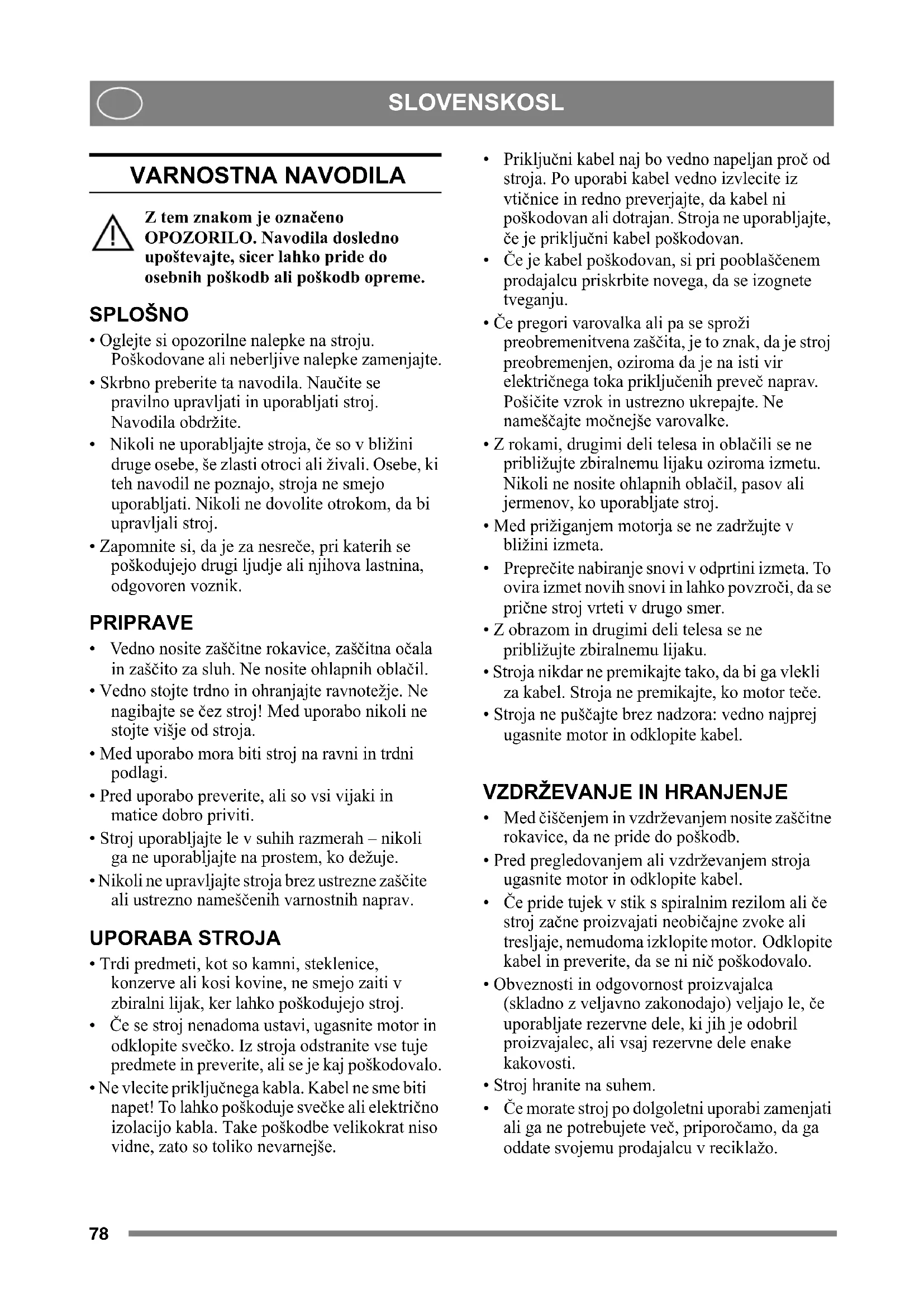 SPLOŠNO Ta simbol pomeni OPOZORILO. Navodila upoštevajte dosledno, sicer lahko pride do resnih poškodb oseb ali opreme. Pred zagonom stroja obvezno preberite ta navodila za uporabo in priložena "VARNOSTNA NAVODILA". SIMBOLI Na stroju so naslednji opozorilni simboli. Njihov namen je, da vas opozarjajo, na kaj morate biti pozorni pri uporabi in vzdrževanju. Simboli pomenijo naslednje: Opozorilo! Natančno preberite vsa navodila. Opozorilo! Odstranite opazovalce. Bodite pozorni na predmete, ki jih stroj izvrže. Opozorilo! Ne vtikajte rok in nog pod ohišje, kadar stroj deluje. Opozorilo!- noži se vrtijo Noľi se vrtijo še nekaj časa po tem, ko ste ugasnili motor Opozorilo! Potegnite vtikač iz vtičnice pred vsakim vzdrževalnim delom. Opozorilo! Stroj uporabljajte le v suhih razmerah – nikoli ga ne uporabljajte na prostem, ko dežuje Opozorilo! Uporabljajte zaščitne rokavice in očala ter zaščitne slušalke. SESTAVLJANJE